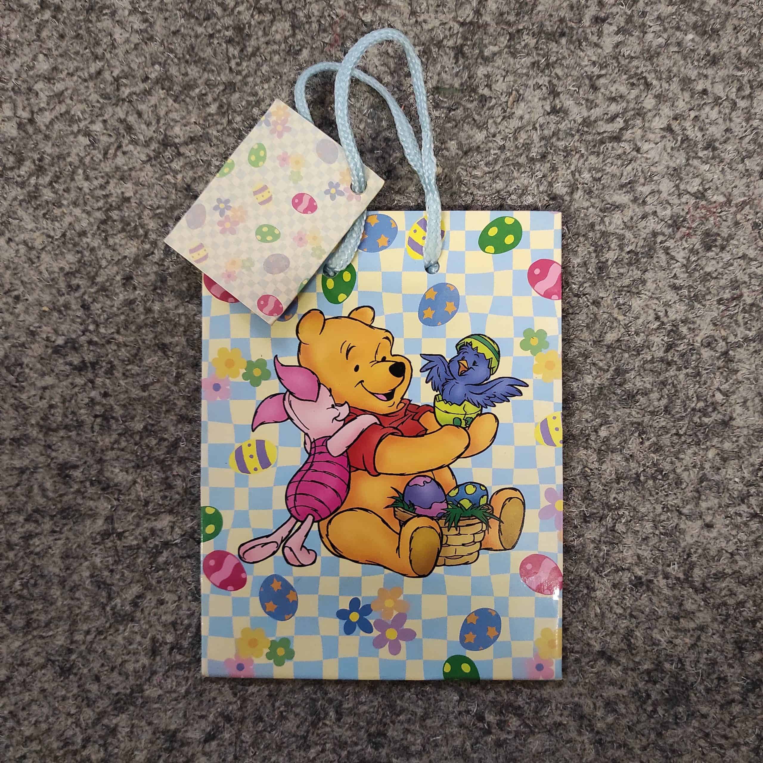Ajándéktáska húsvéti, színes. Micimackó és Malacka képpel, tojásokkal. Méretei 26x32cm-es. Világoskék-sárga kockás alapon. Termékkód: 13004
