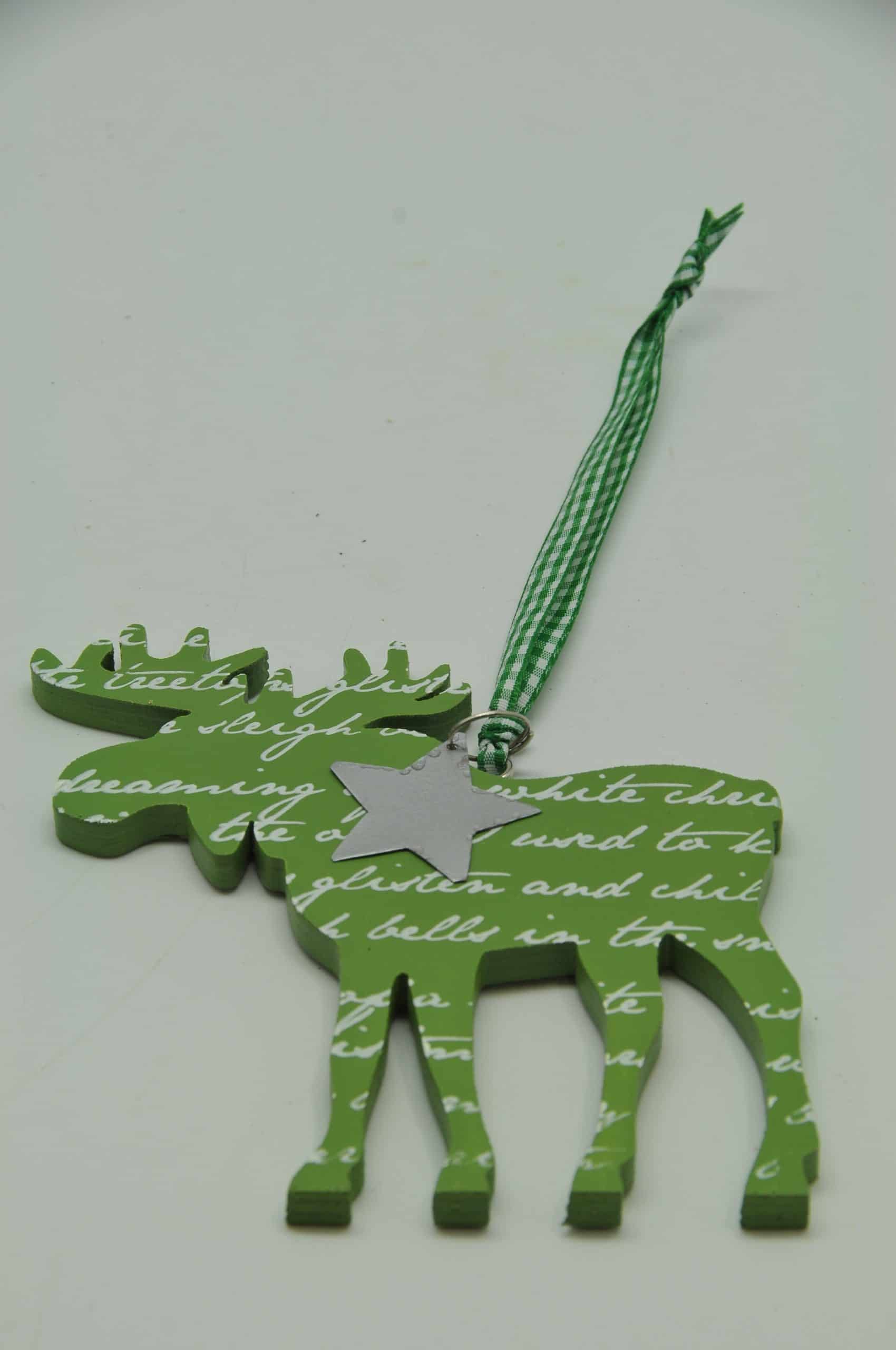 Akasztós rénszarvas, ajtódísz, fa. Írás mintával és fém csillaggal. Kockás szalag akasztóval. Mérete 22cm. Zöld és fehér színű. Termékkód: dd36627