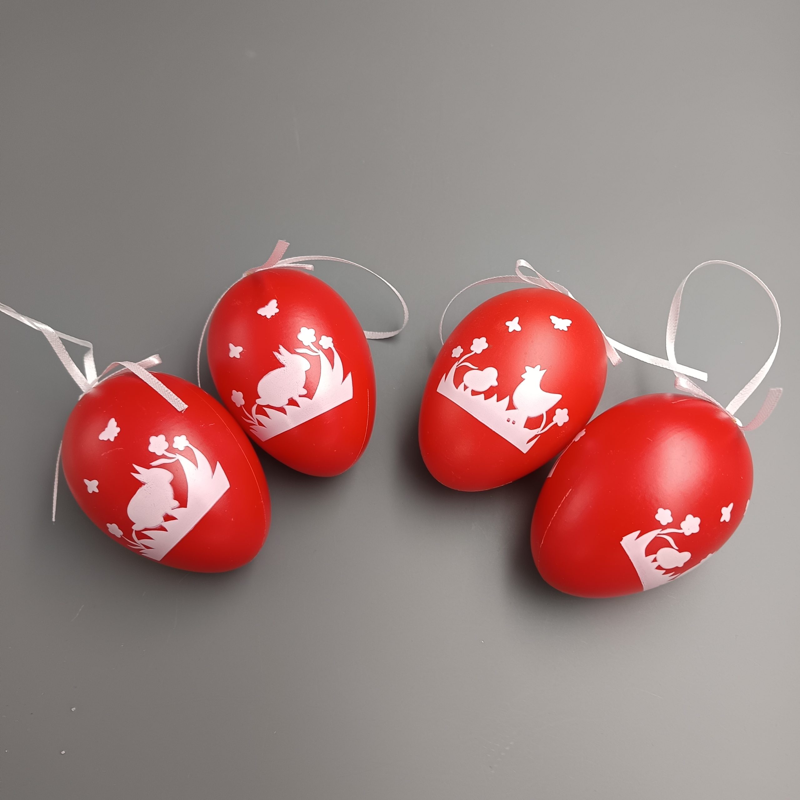 Akasztós tojás, műanyagból. Nyuszis, csibés és tyúkos mintával, pillangókkal és virágos réttel a háttérben. A csomag négy darab 10cm-es tojást tartalmaz. Piros és fehér színű. Termékkód: js241467