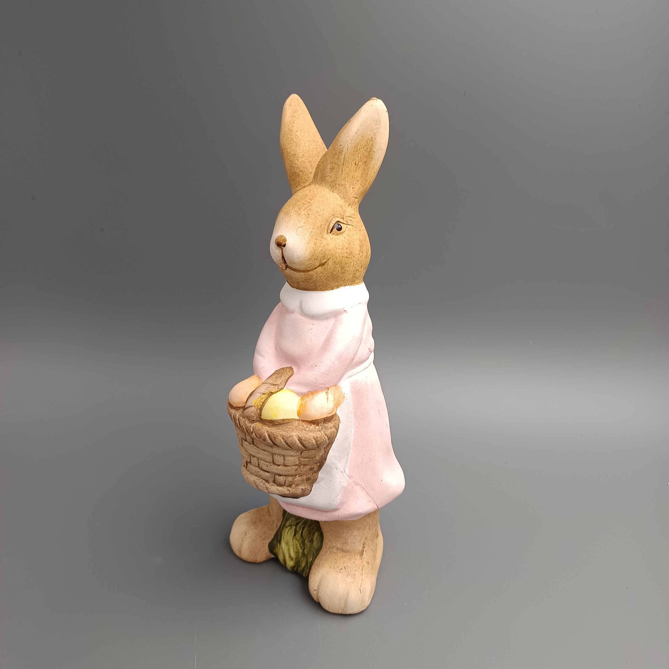 Álló nyuszi lány kerámiából. Tojásokkal teli kosárral a kezében. Vidéki stílusú húsvéti figura, mely ideális ünnepi dekorációnak. Mérete 5,5x9x22cm. Rózsaszín, fehér, sárga és barna színű. Termékkód: b33529