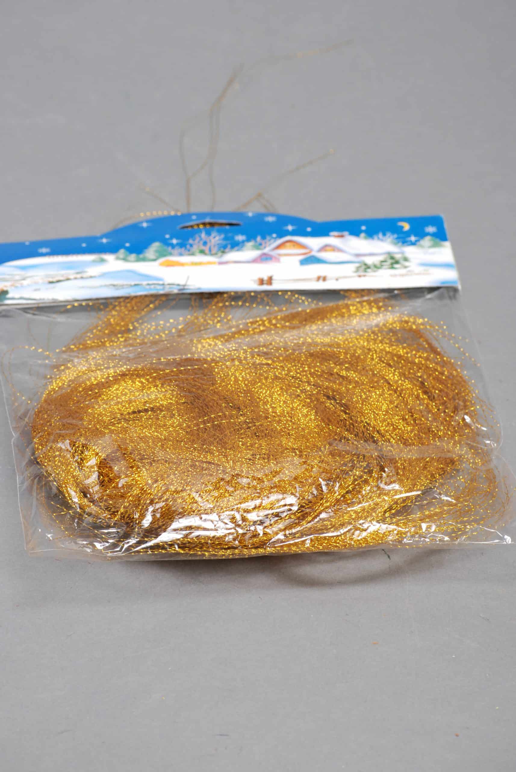 Angyalhaj, műanyag. Karácsonyfa díszítésére használható, nagyon vékonyra kihúzható szál. Mérete 20g. Arany színű. Termékkód: dd3284