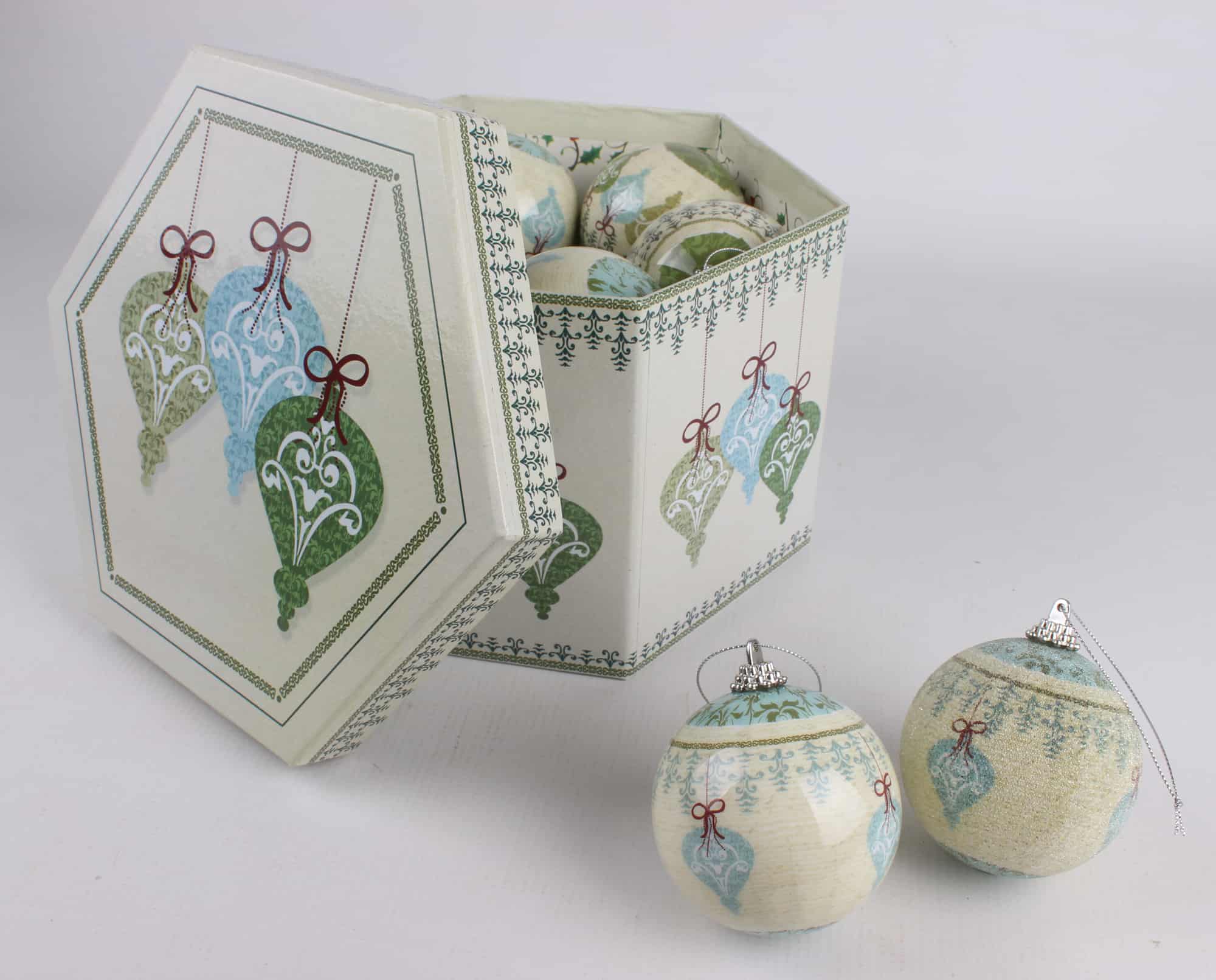 Díszdobozos gömb,akasztós,műanyag. Karácsonyfadísz mintával. Mérete 7cm.A doboz 14db gömböt tartalmaz,fele cukros,fele sima felületű. Krém,zöld,kék színű. Termékkód: qx455379