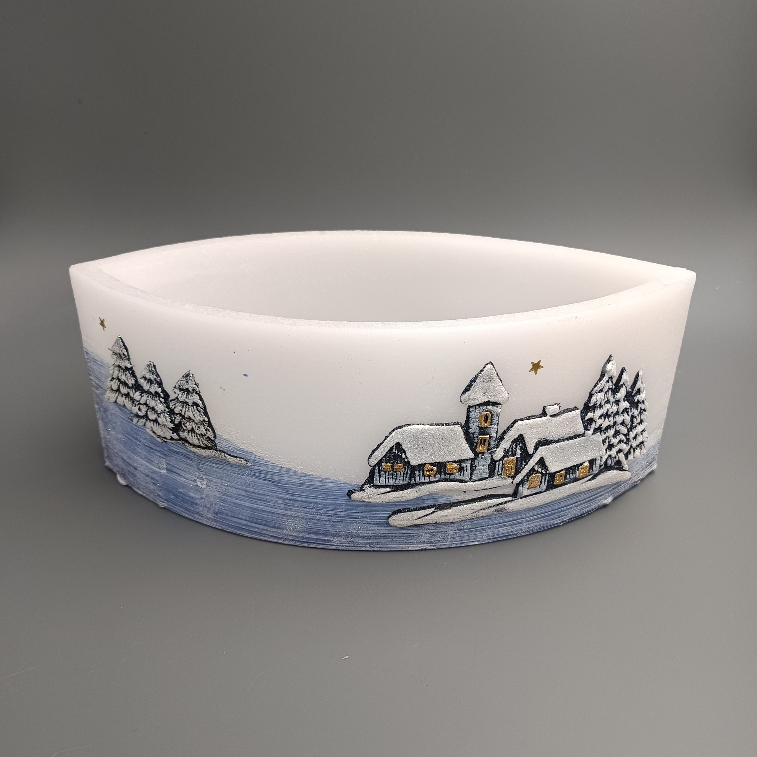 Gyertya mécsestartókkal, csónak formájú. Oldalán körbe futó téli tájjal, csillámos festéssel. Mérete 11x14x29cm. Fehér, kék és arany színű. Termékkód:b48136