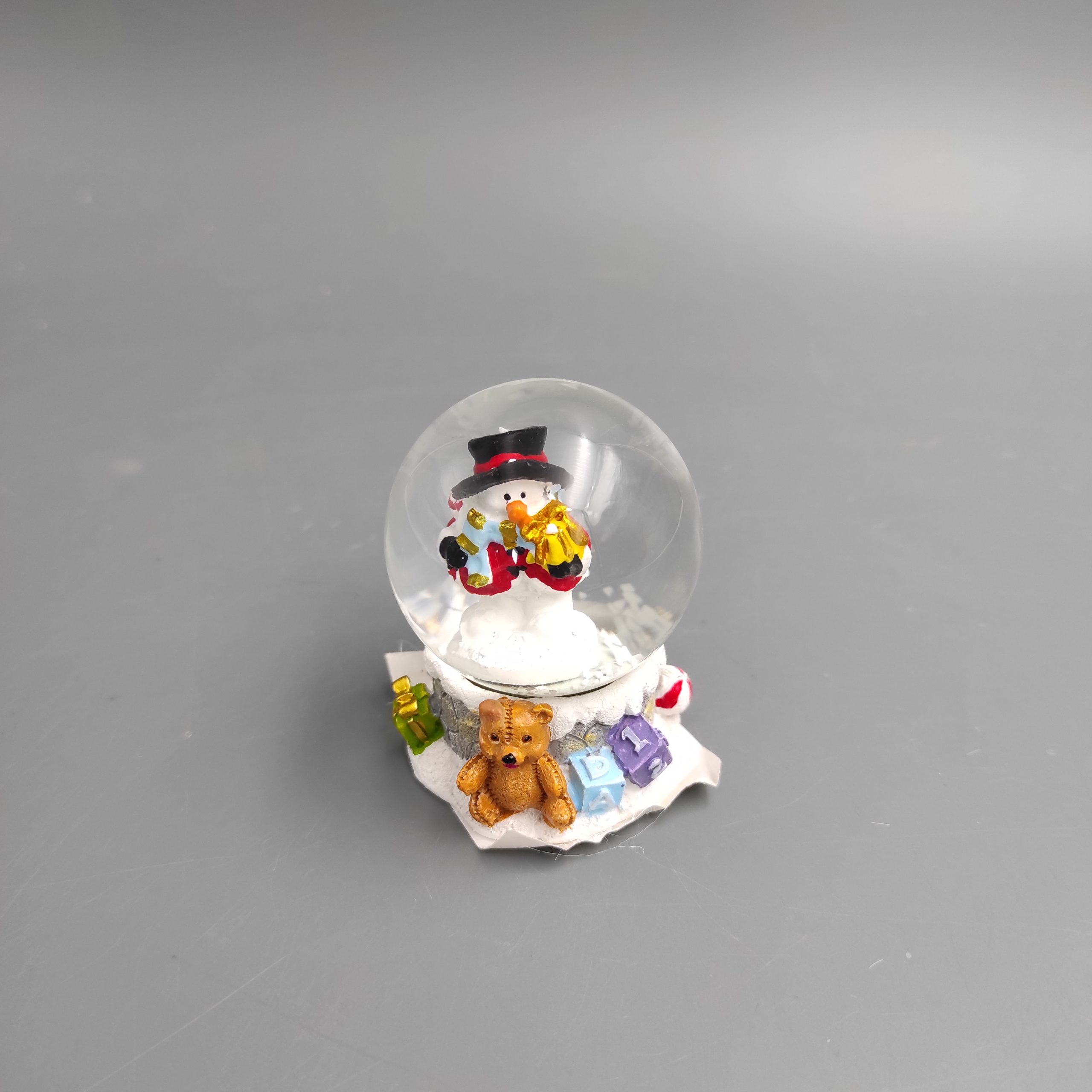 Hógömb hóemberes, üveg és műanyag. Az alján macival, labdával és ajándékokkal. Mérete 4,5x6cm. Színes. Termékkód: at237769