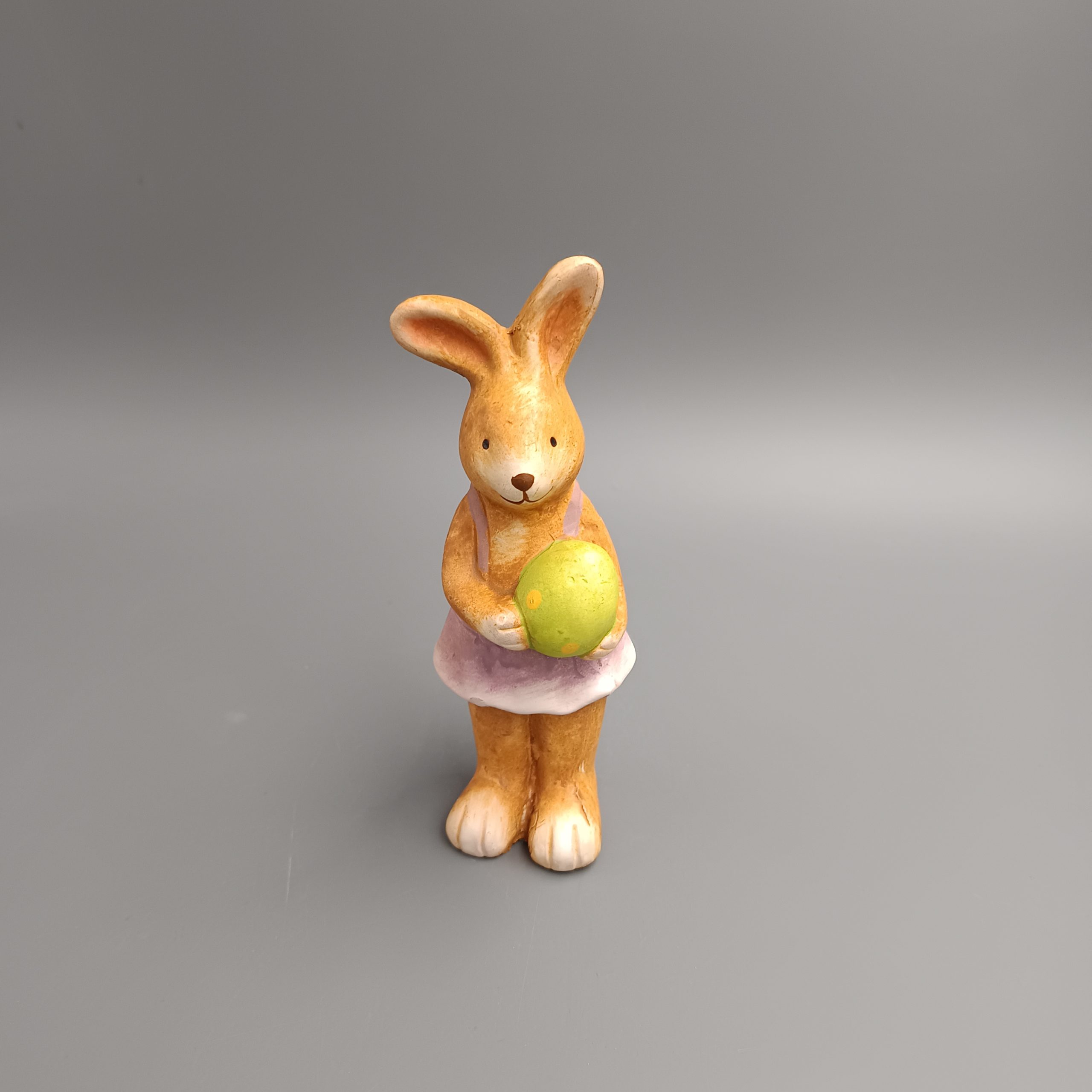 Húsvéti nyúl kislány, kerámiából. Pöttyös tojással a kezében, hosszú fülekkel, szoknyában. Mérete 4x6x14cm. Barna, lila, zöld és sárga színű. Termékkód: at240611
