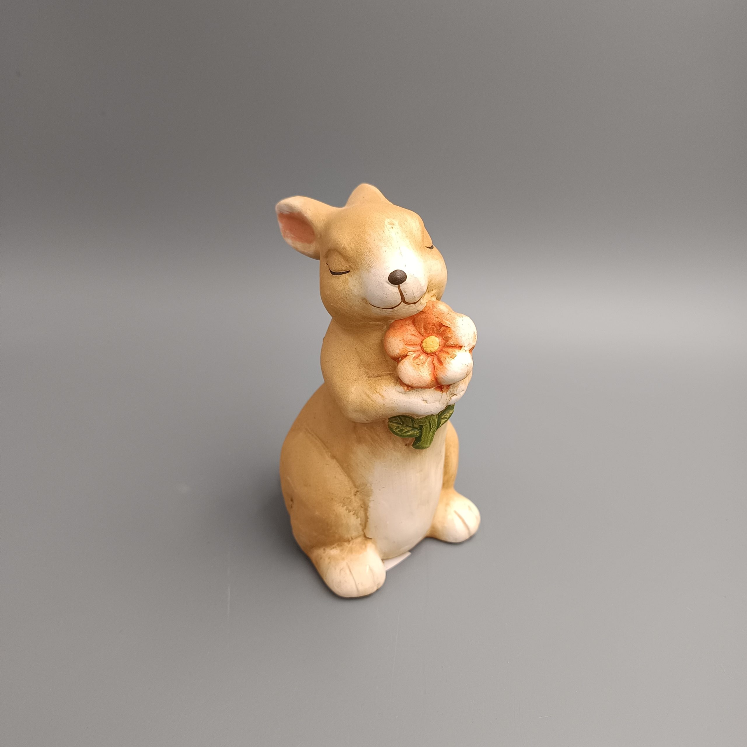 Húsvéti nyuszi, álló, kerámiából. Hosszú fülekkel, csukott szemekkel, kezében egy szál virággal. Mérete 8x9x14cm. Barna, fehér, zöld és piros színű. Termékkód: at240609