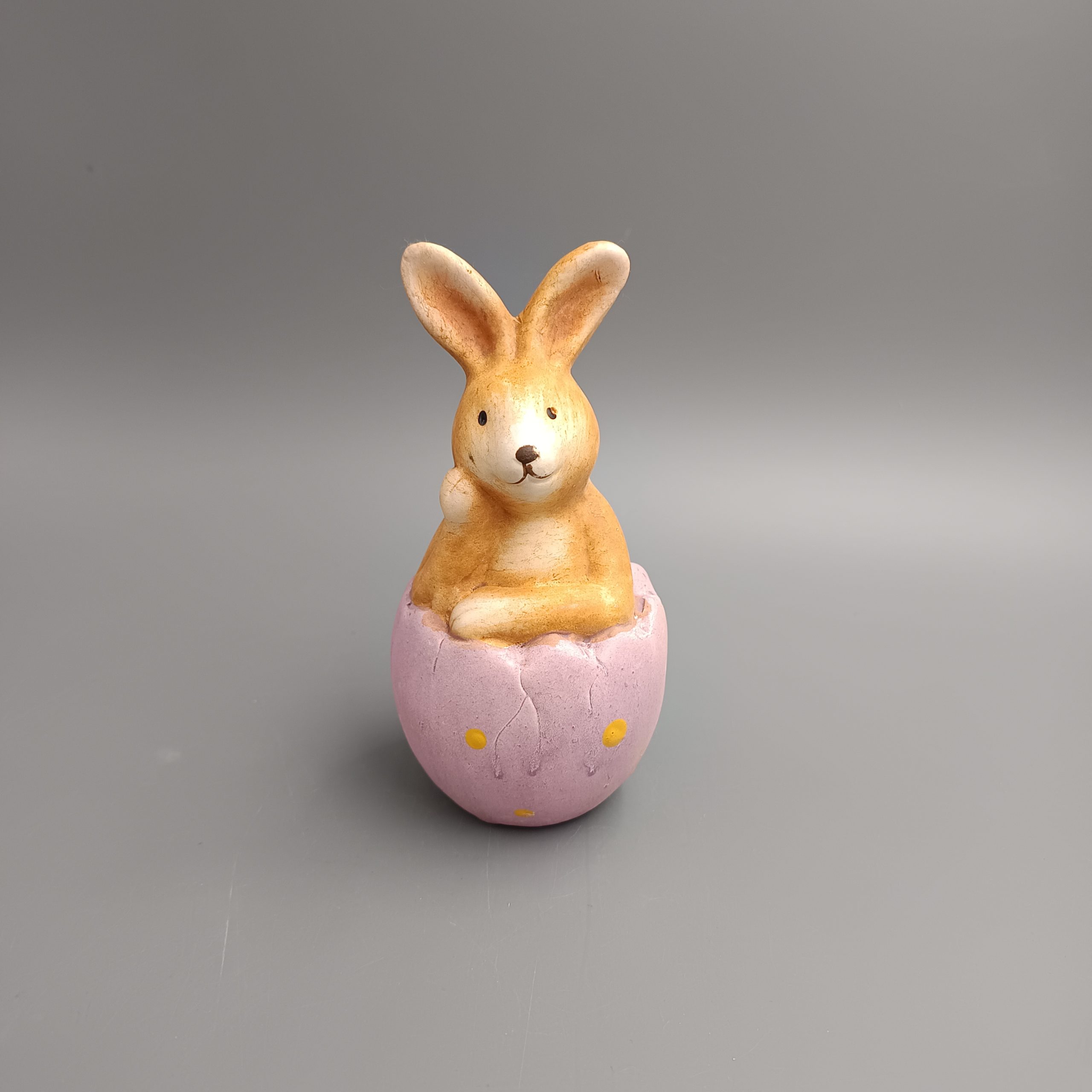 Húsvéti nyuszi fiú, kerámiából. Pöttyös tojásban ülő, hosszú fülű, karján könyöklő. Mérete 7x7x14,5cm. Barna, lila és sárga színű. Termékkód: at240612a