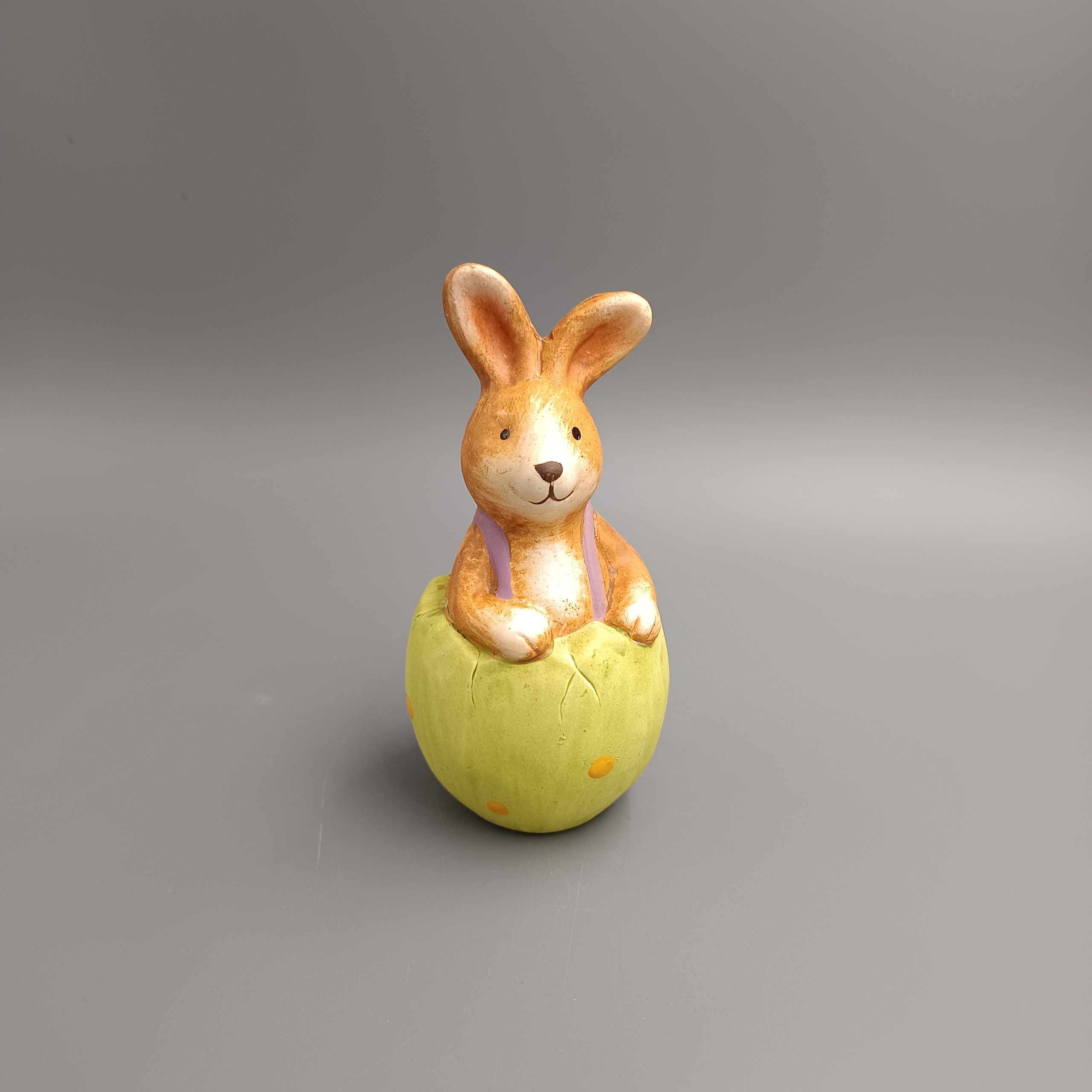 Húsvéti nyuszi lány, kerámiából. Pöttyös tojásban ülő, hosszú fülű, karjain támaszkodó. Mérete 7x7x14,5cm. Barna, lila, zöld és sárga színű. Termékkód: at240612