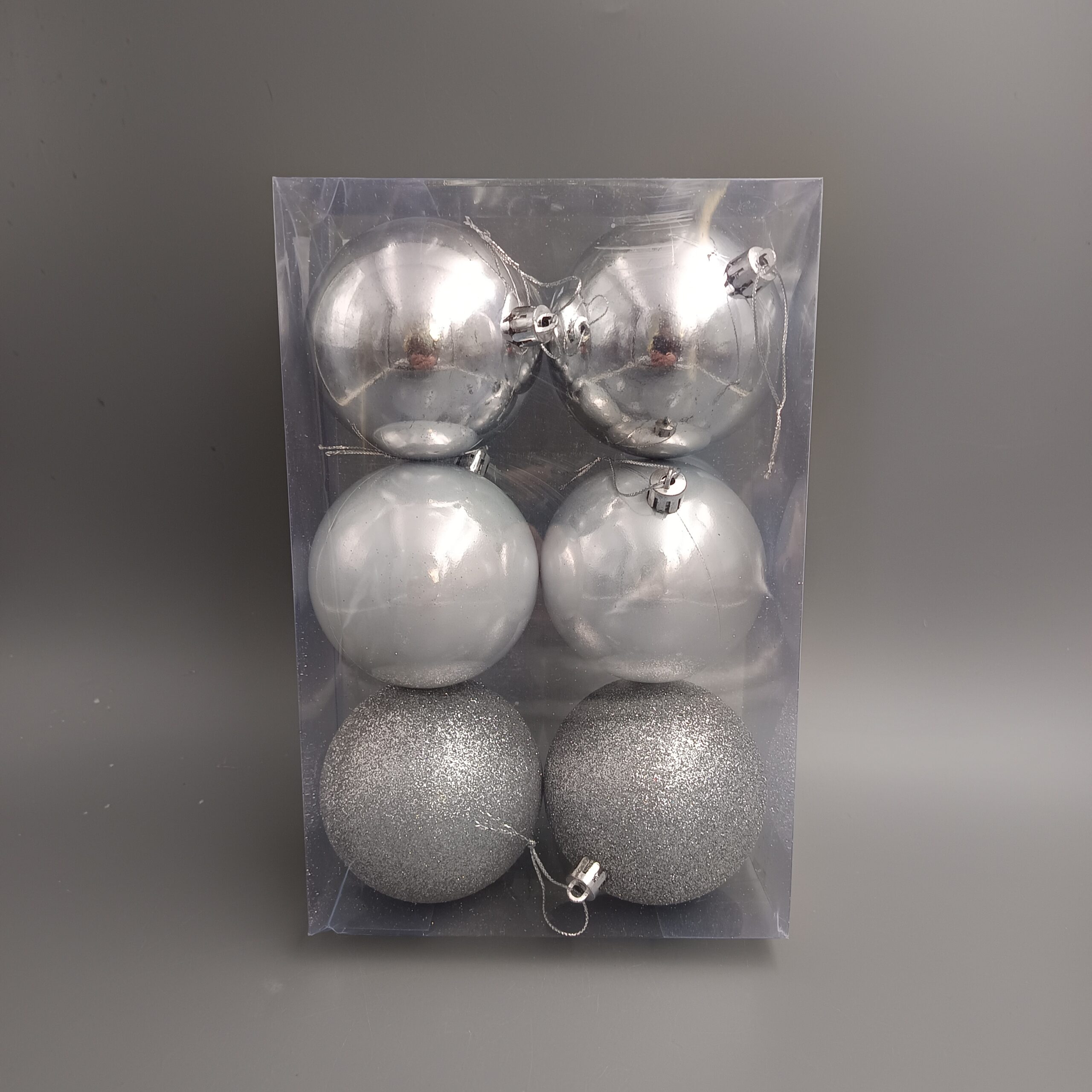 Karácsonyfadísz akasztós műanyag. A doboz 6 darab 8cm-es gömböt tartalmaz. Kettő-kettő gyöngyház, fényes, csillámos ezüst színű dísz. Termékkód: js171177