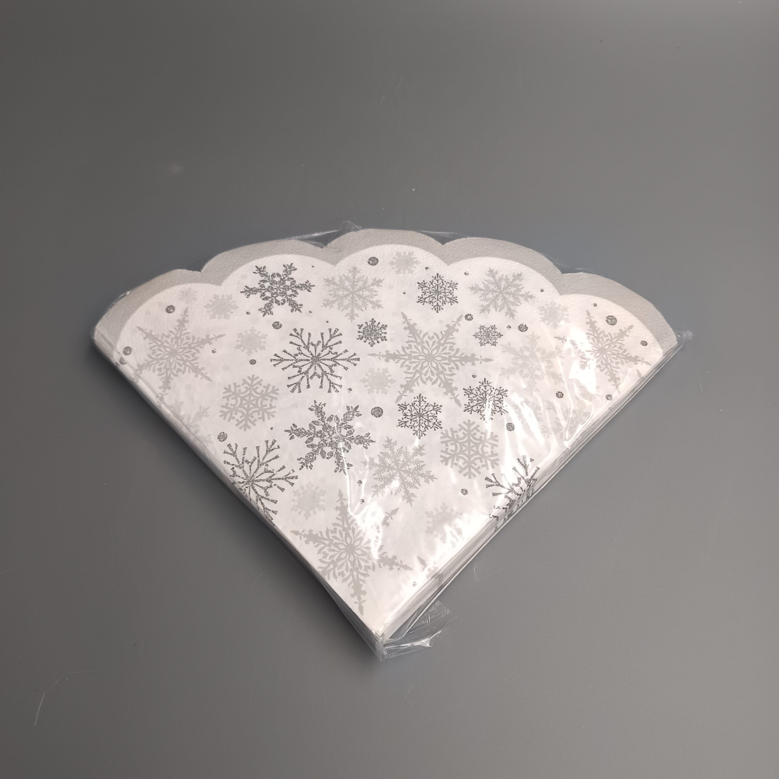 Karácsonyi szalvéta, legyező formájú. Fehér alapon szürke és ezüst hópelyhes mintával. Mérete összehajtva 16x16cm. A csomag 20 darab szalvétát tartalmaz. Termékkód:bt5499