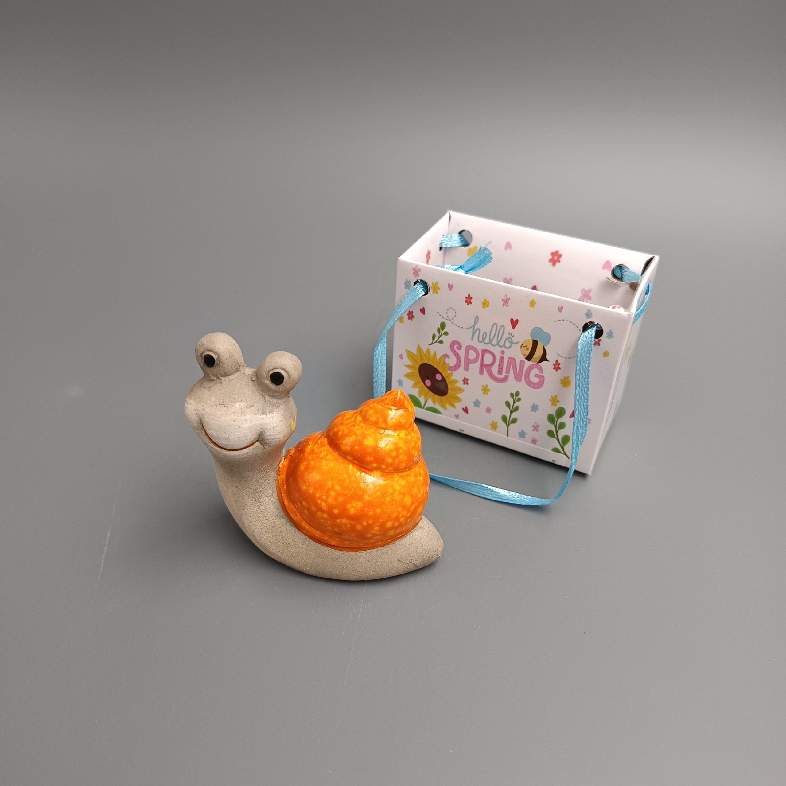 Kerámia csiga, ajándéktasakban. Nagy szemekkel, mosolygós arccal. Tavaszi dekoráció. Mérete 3x5x5cm. Narancssárga és szürke színű. Termékkód: at241265b