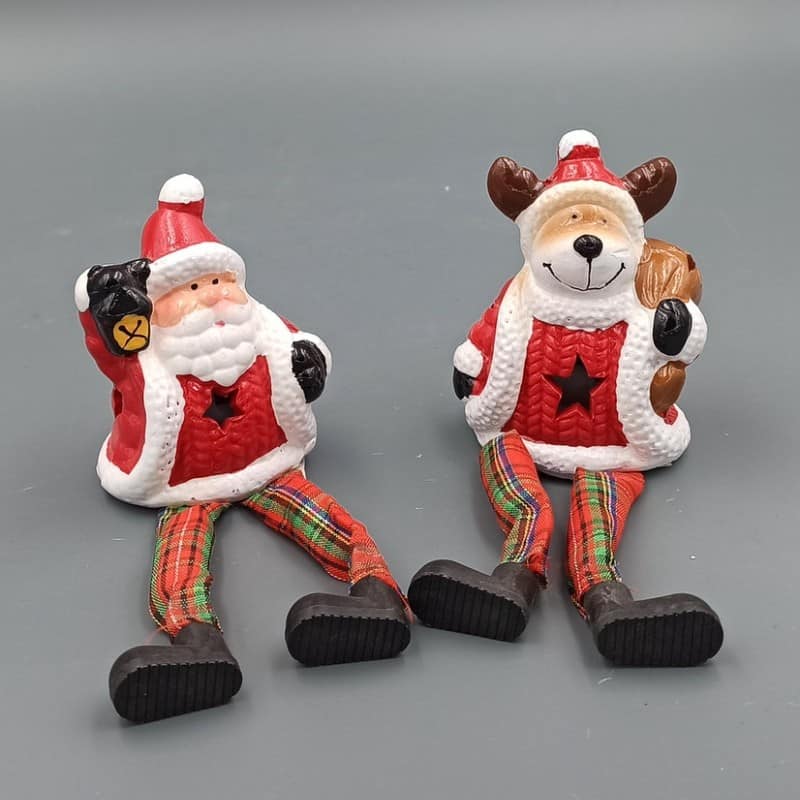 Kerámia rénszarvas, lógólábú. Zsákkal a kezében és kockás nadrágban. Ledes, elemmel működik. Mérete 6x6x20cm. Piros, fehér és zöld színű. Termékkód: b52253