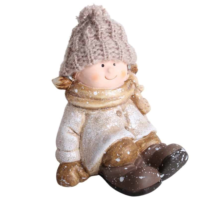 Ülő kislány, kerámia. Kötött, pomponos sapkában és sállal a nyakában. Mérete 9x11cm. Barna, fehér és krém színű. Termékkód: qx146018a