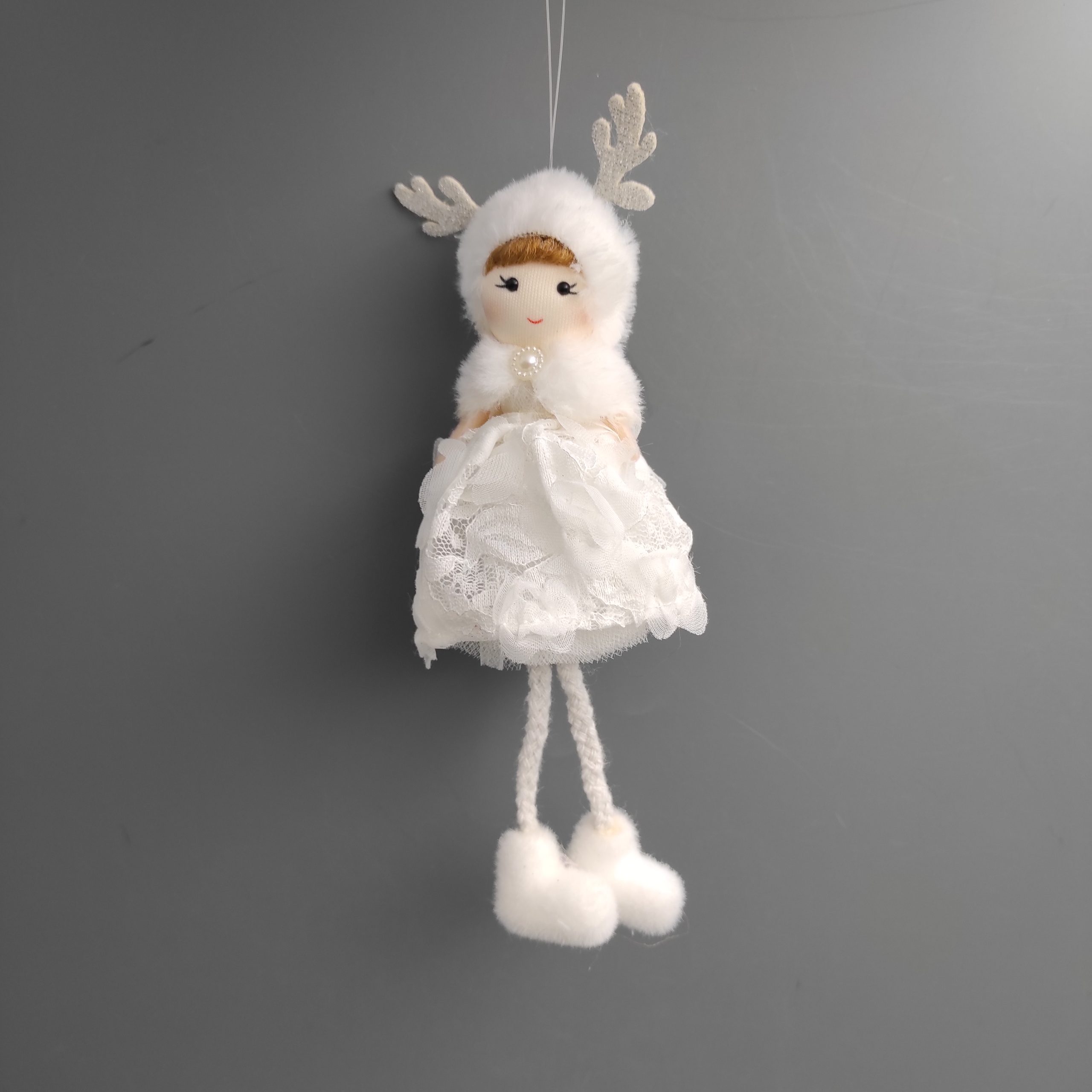 Kislány akasztós, textil. Prémes, csipke ruhában, szarvas agancsos sapkában. Mérete 8x8x20cm. Fehér színű. Termékkód: qx060585