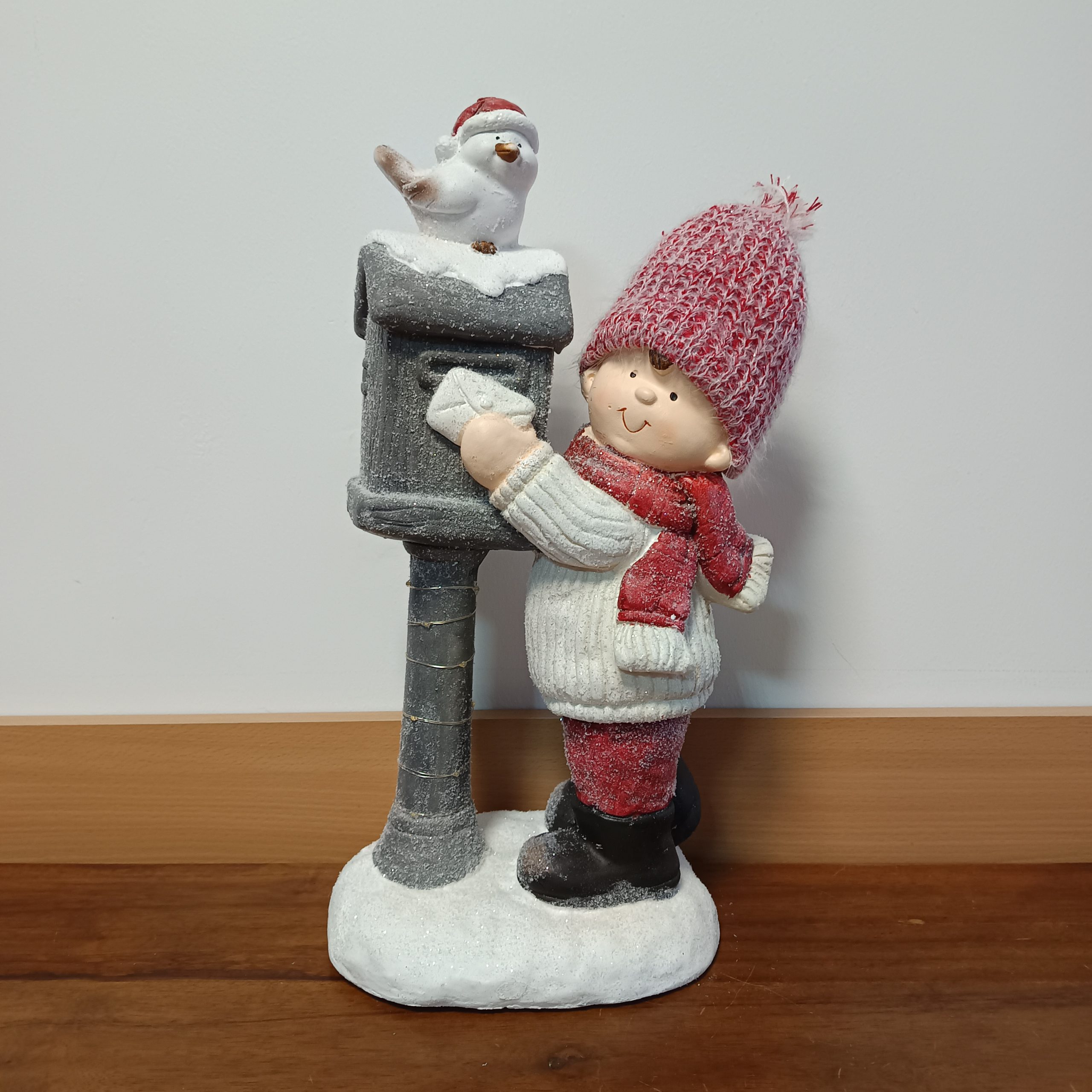 Kerámia kisfiú, álló, postaládával, madárral. Kötött sapkában. Ledes, elemmel működik. Mérete 23,5x16x56cm. Piros, fehér és szürke színű. Termékkód: dd59907