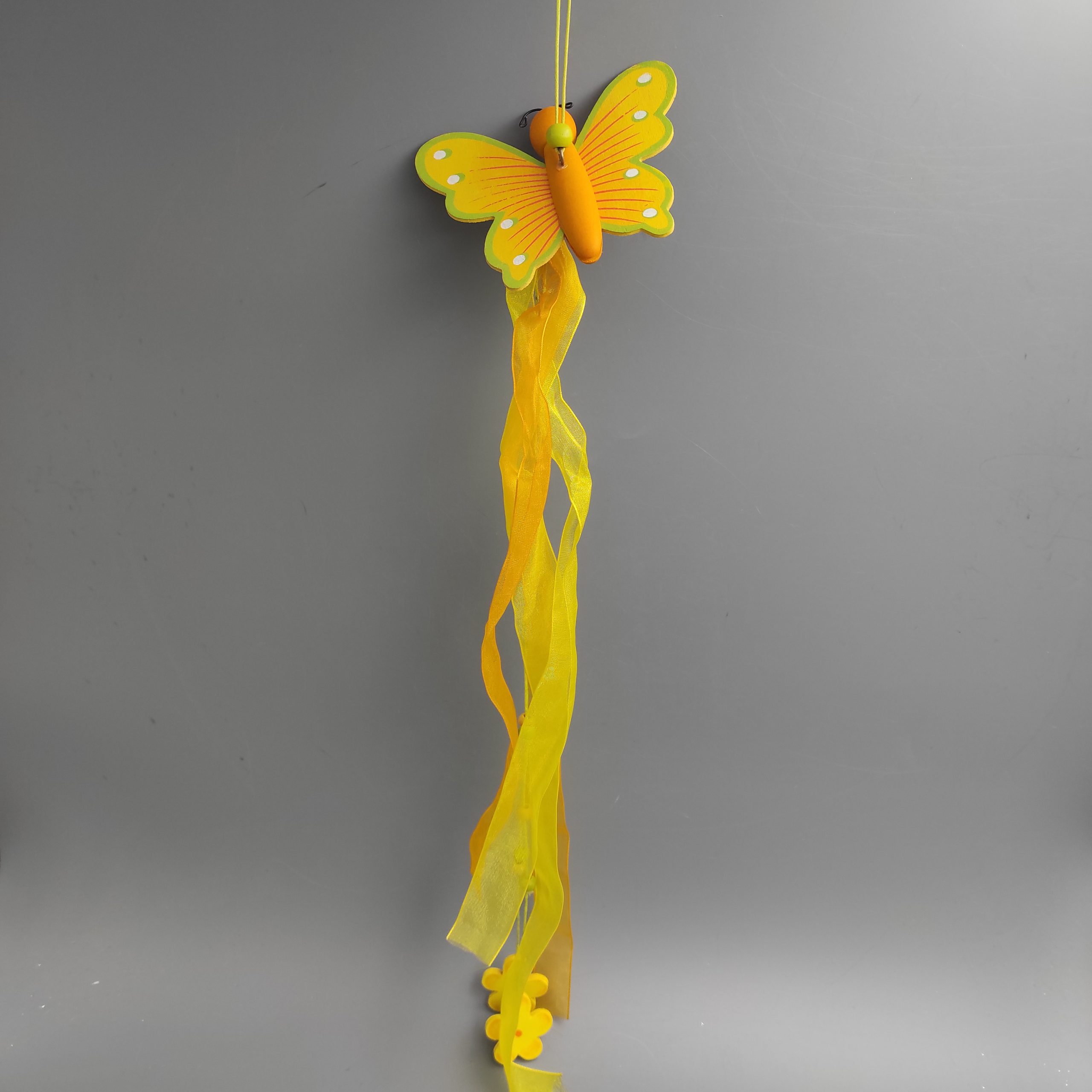 Lepkés ajtódísz, akasztós, fa. Virágos lógóval, szatén szalaggal. Mérete szalaggal együtt 11x45cm. Sárga, narancs és zöld színű. Termékkód: dd8899