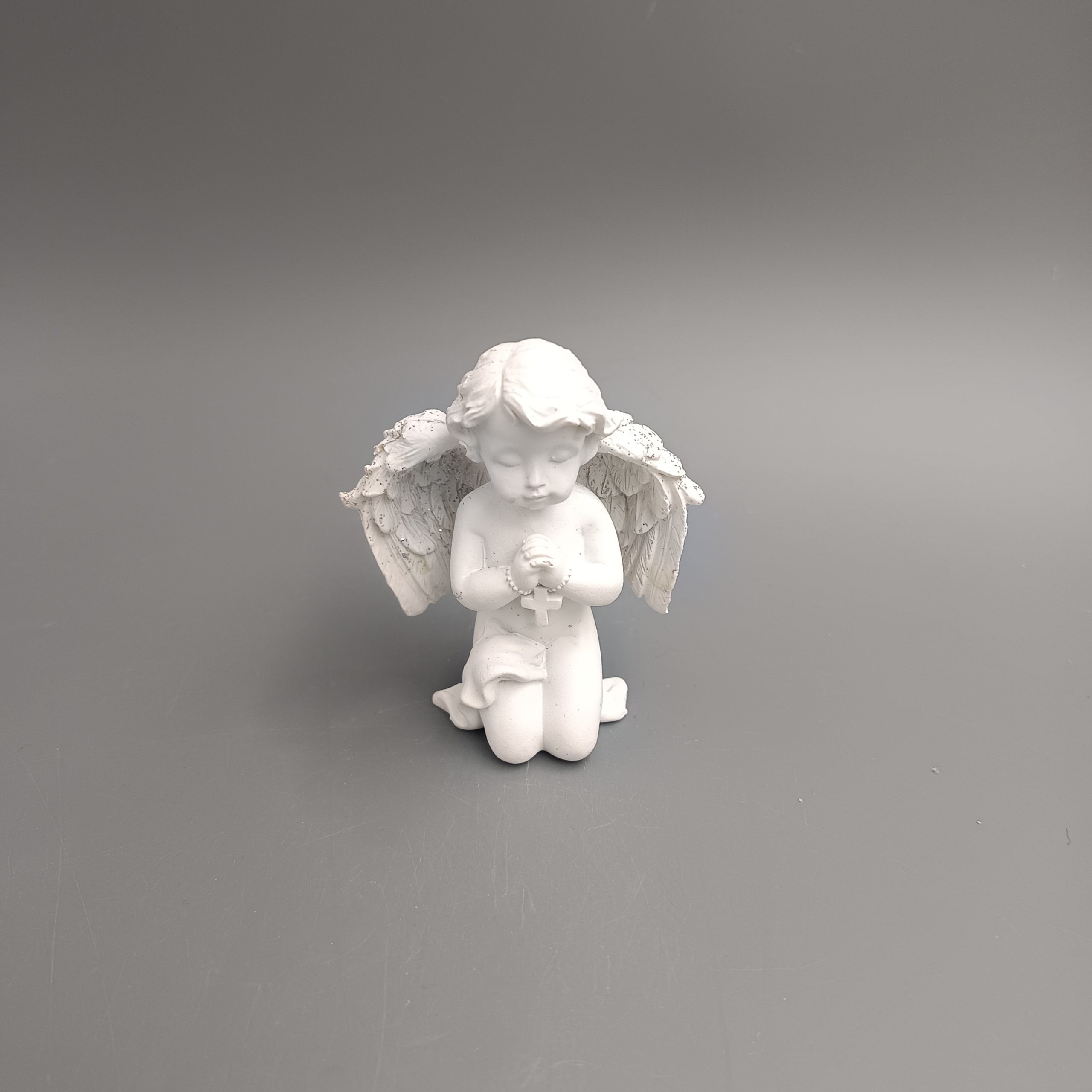 Műanyag angyalka, térdelő, csillámos. Kereszttel a nyakában. Dekorációs alapanyag. Mérete 7x4x8cm. Fehér és ezüst színű. Termékkód: dd50579