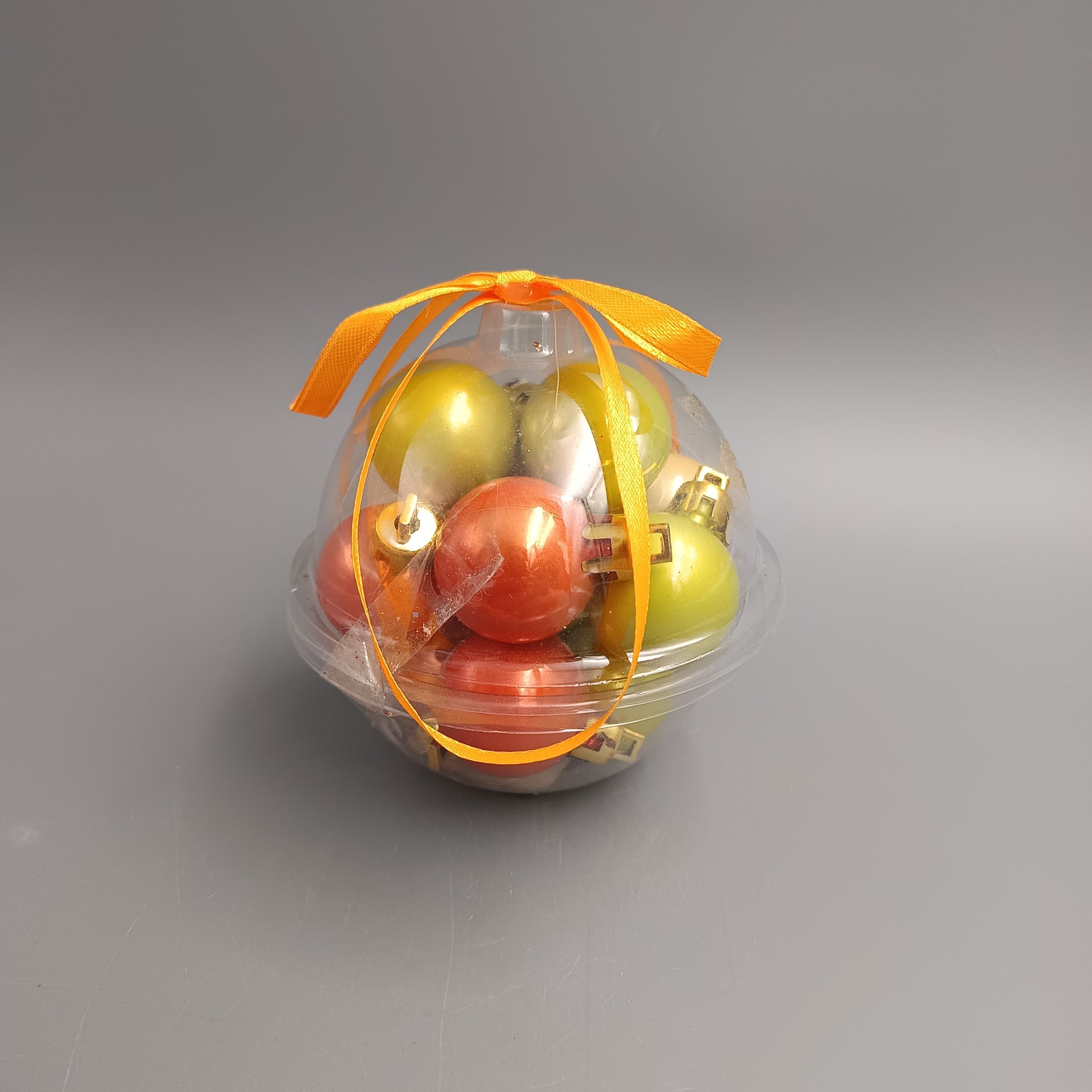 Műanyag gömb, akasztós, fényes. Mérete 3cm. A doboz 12 darab gömböt tartalmaz. Narancssárga, zöld és krém színű. Termékkód: qx454672