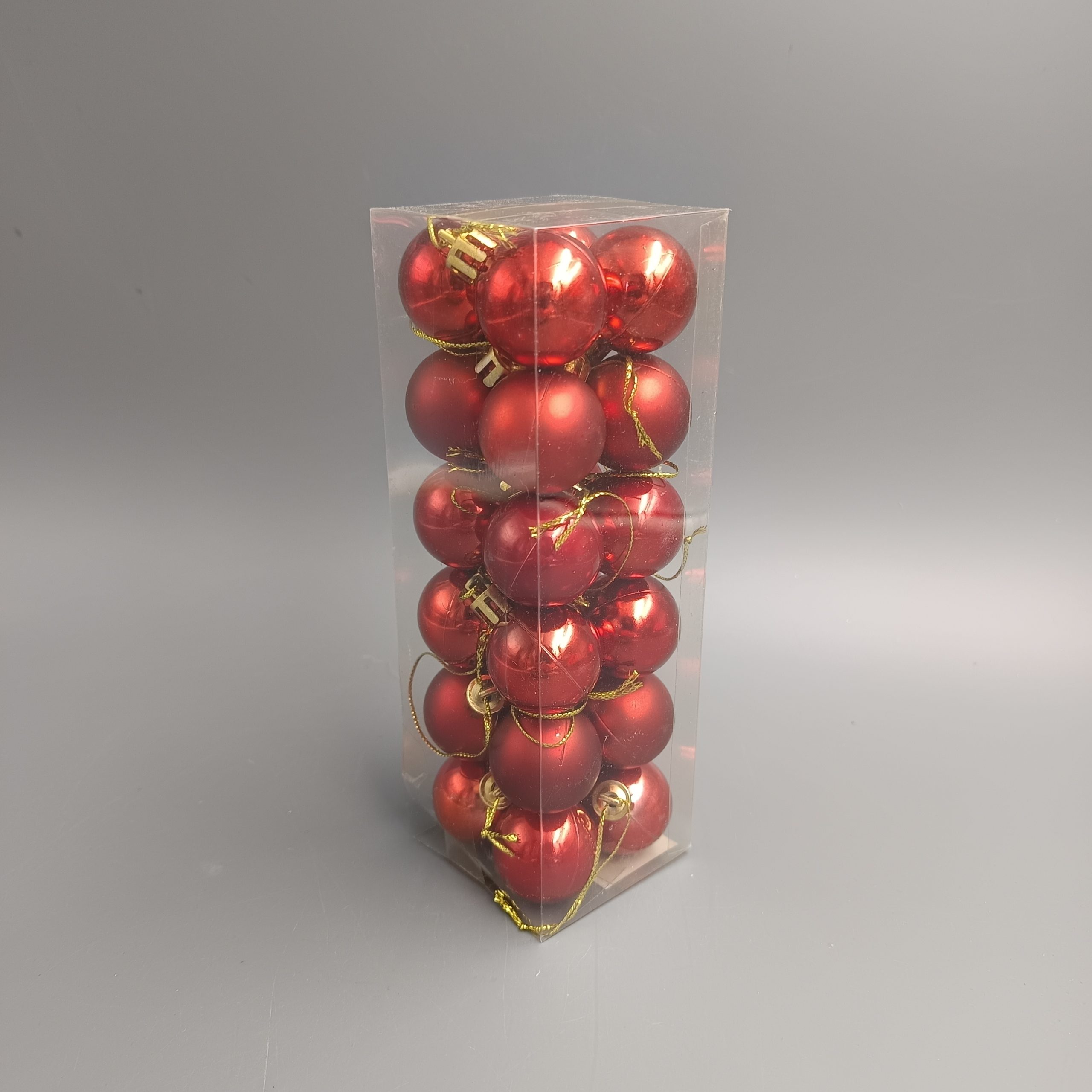 Műanyag gömb, akasztóval. A gömb átmérője három cm. A doboz 24 darab gömböt tartalmaz. Matt, gyöngyház és fényes piros színű. Termékkód: dd63084