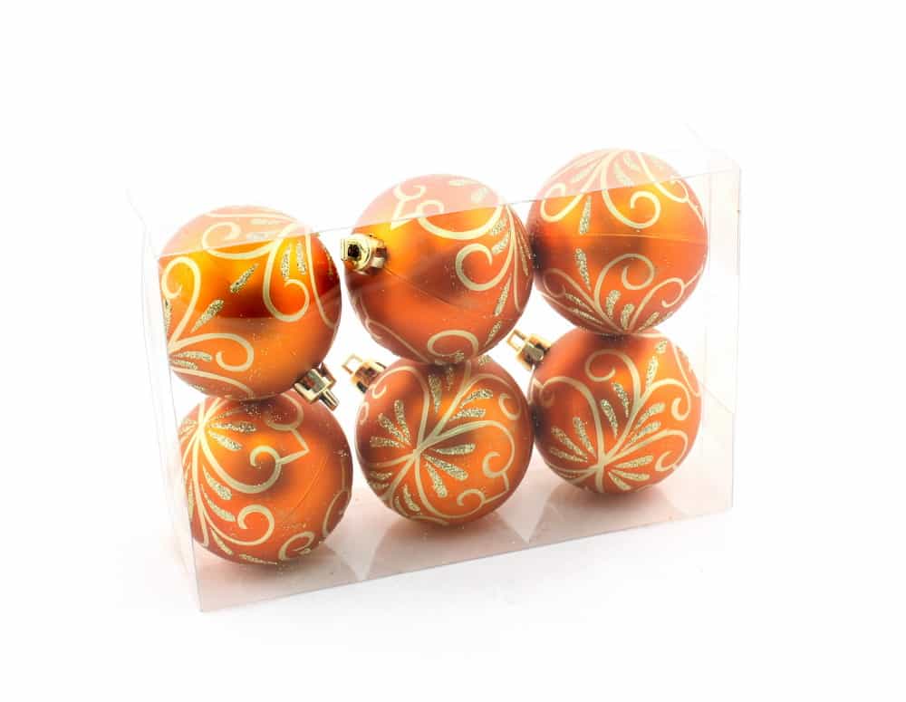 Gömb ciráda mintás, akasztós, műanyag. Mérete 6cm. A doboz 6 darab gömböt tartalmaz. Narancssárga és arany színű. Termékkód: qx454664
