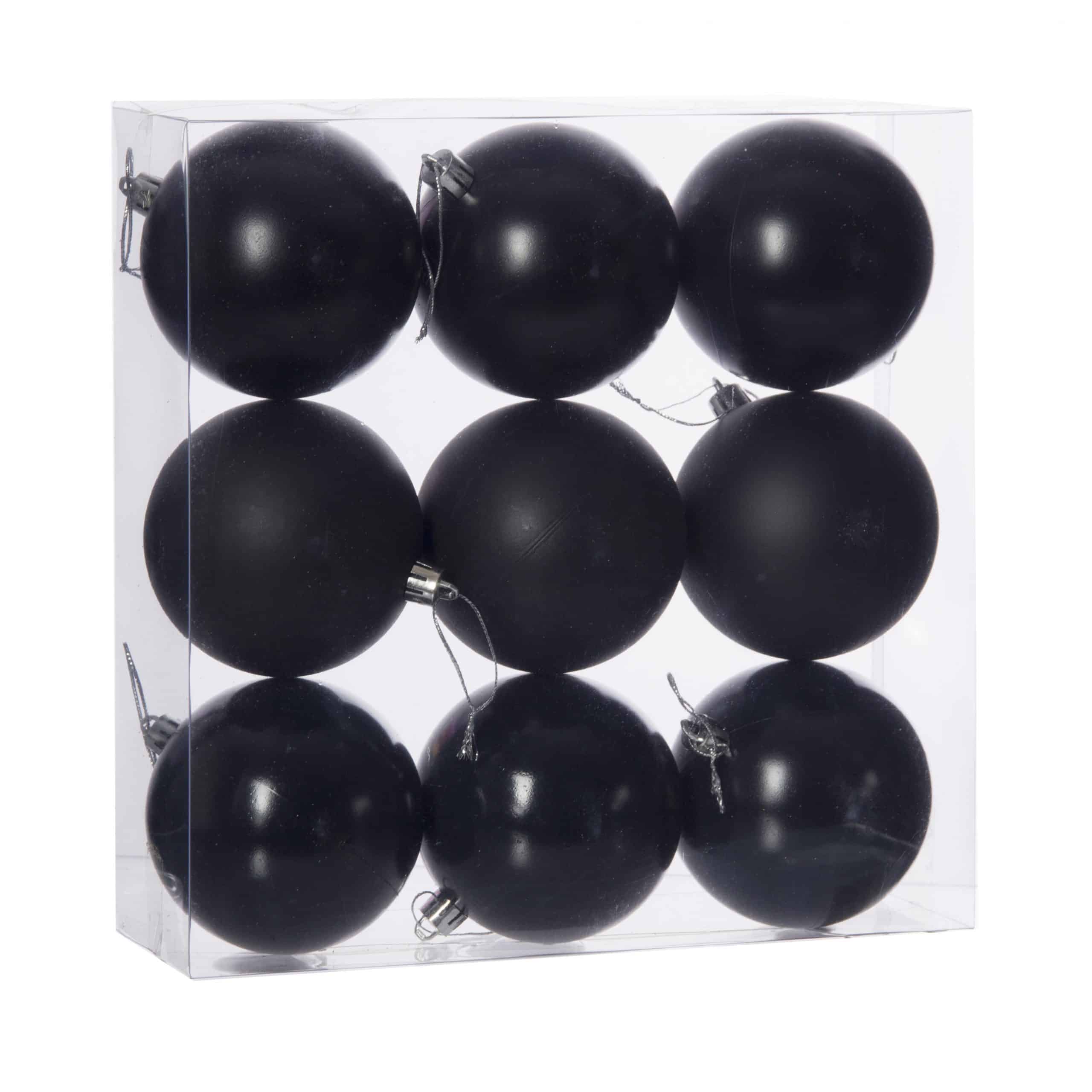 Műanyag gömb, akasztóval. Fényes, gyöngyház és matt. A gömb átmérője 8cm. A doboz 9 darab gömböt tartalmaz. Fekete színű. Termékkód: dd51254
