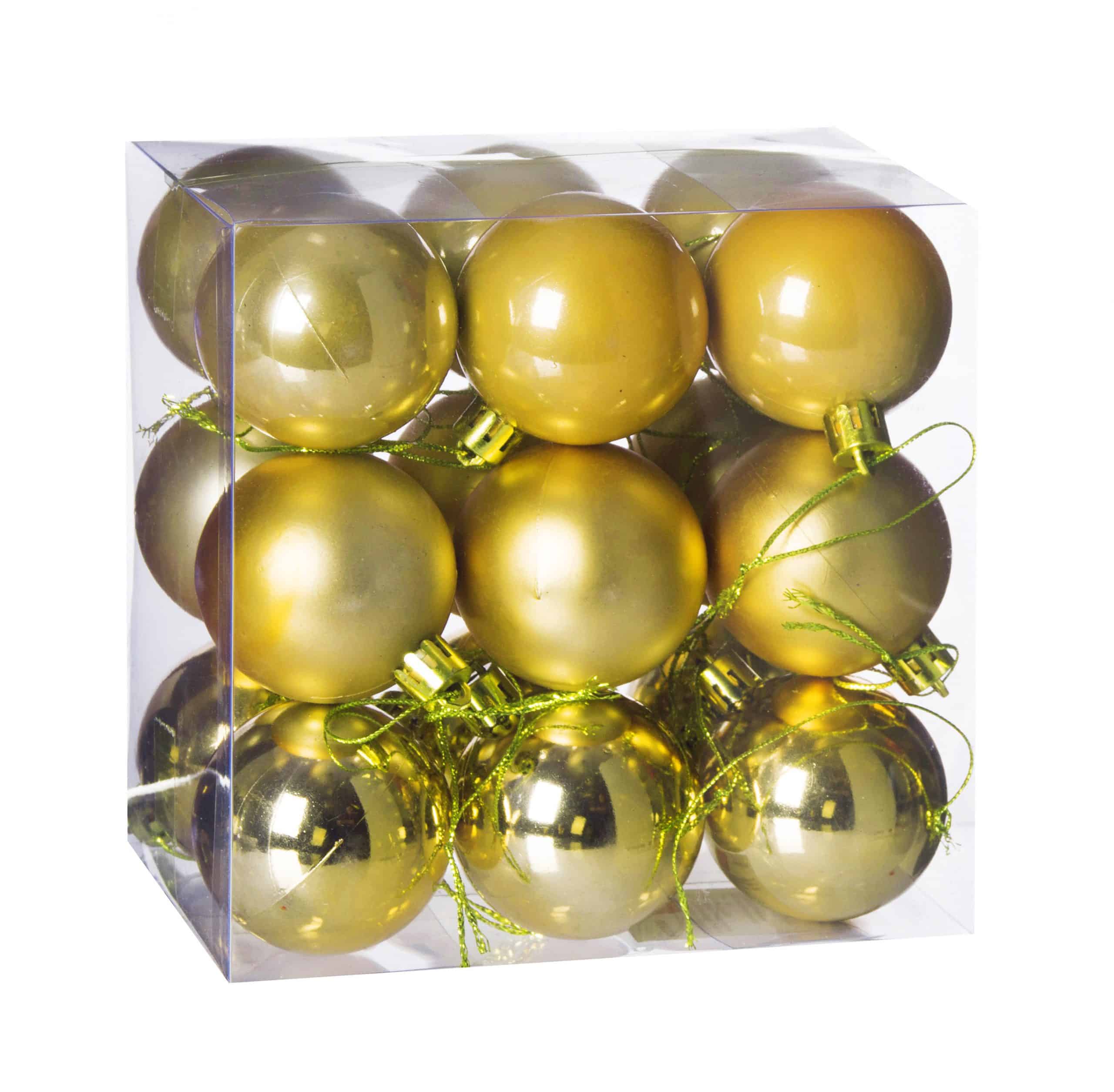 Műanyag gömb, akasztóval. Fényes, gyöngyház és matt. A gömb átmérője 5cm. A doboz 18 darab gömböt tartalmaz. Arany színű. Termékkód: dd51222