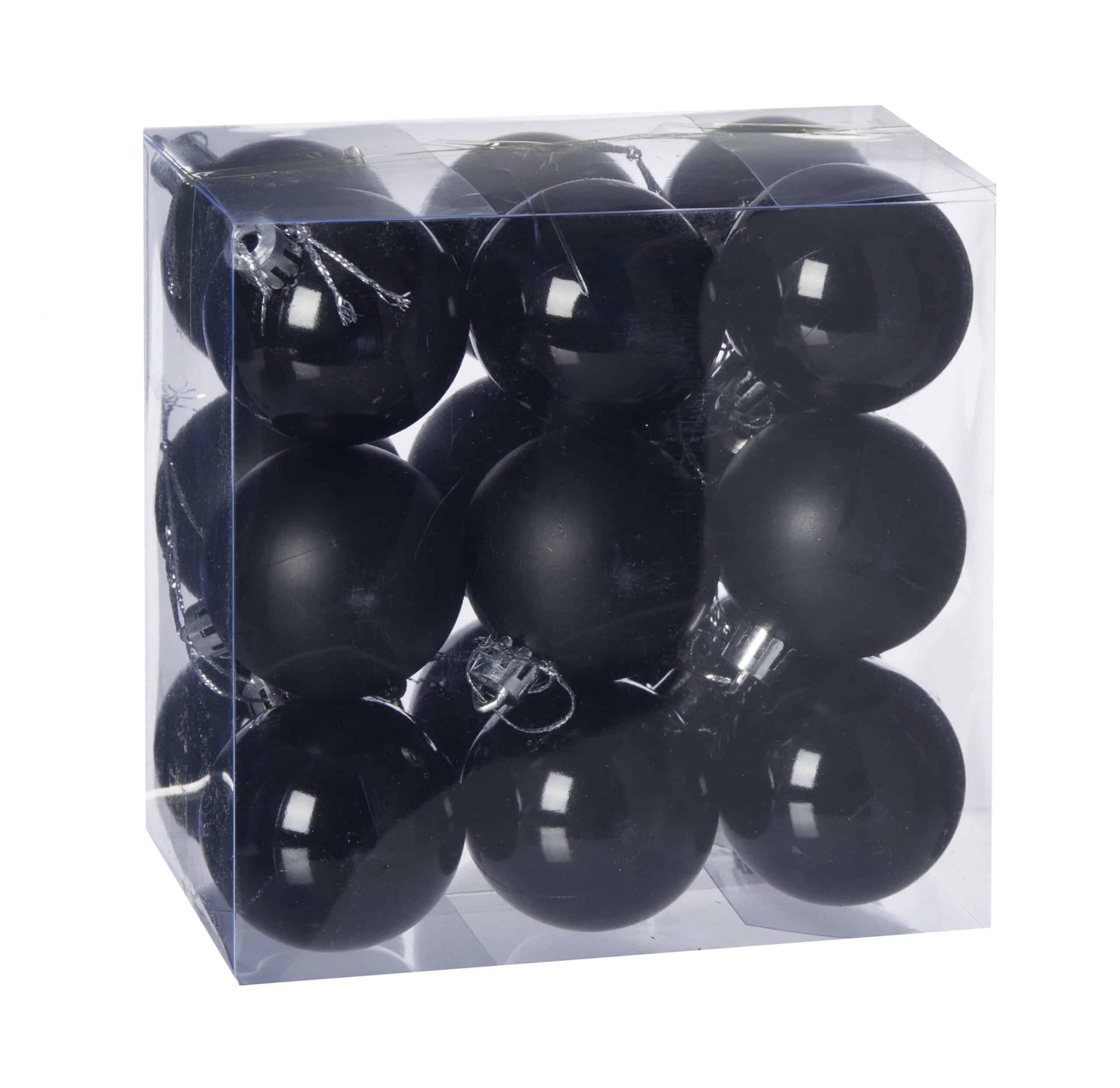 Műanyag gömb, akasztóval. Fényes, gyöngyház és matt. A gömb átmérője 5cm. A doboz 18 darab gömböt tartalmaz. Fekete színű. Termékkód: dd51207