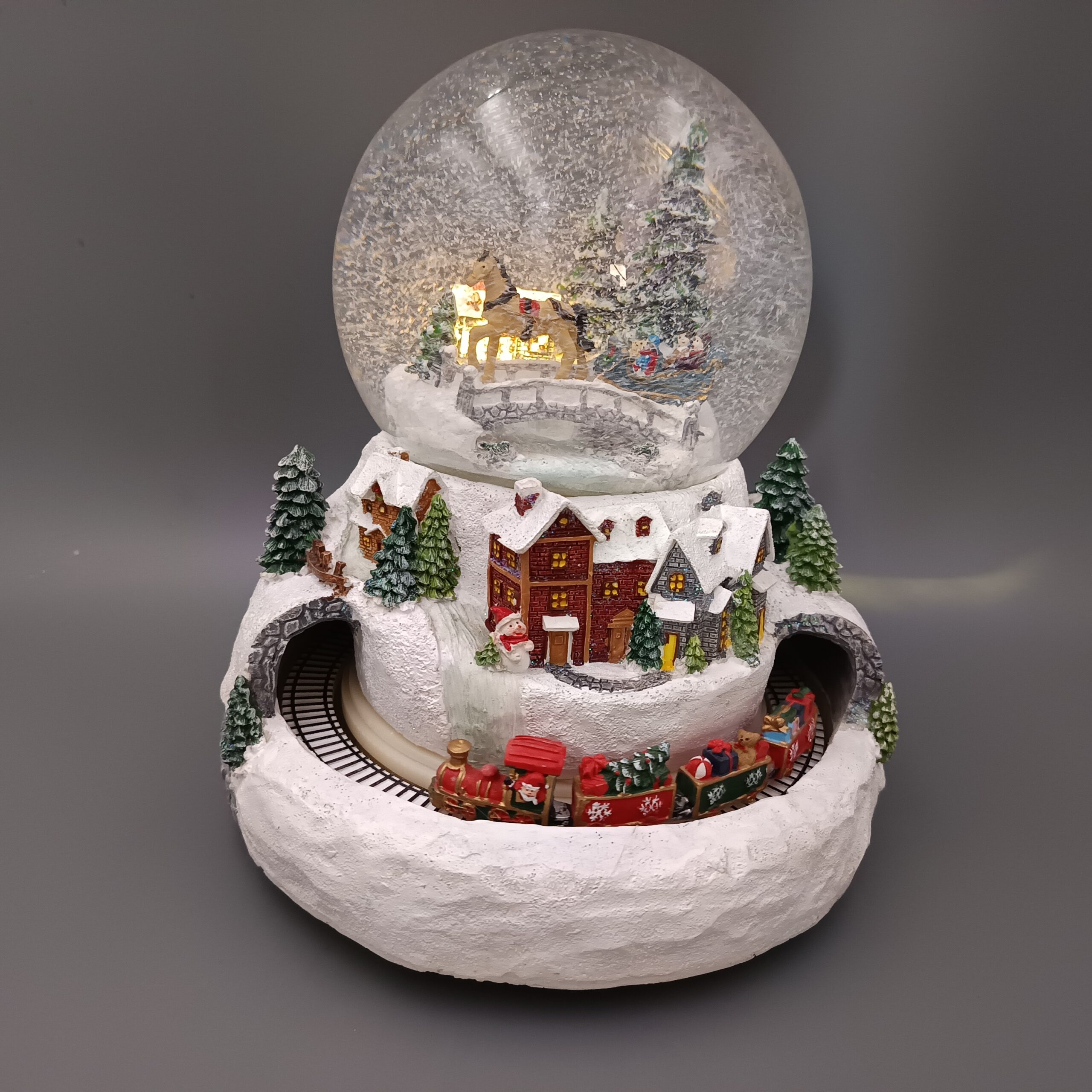 Óriás hógömb, műanyagból és üvegből. A hógömb belsejében téli táj látható, egy lovas szánnal és fenyőfákkal. A gömb alatti talapzat havas hegyvidéki tájat mintáz, rajta házakkal és egy alagúttal, amelyből egy karácsonyi ajándékokkal megpakolt vonat bukkan elő, körbe haladva a talapzaton. Zenélő, mozgó, magától havazó, világító, elemmel működik. Mérete 21x24cm. Színes. Termékkód:qx045933
