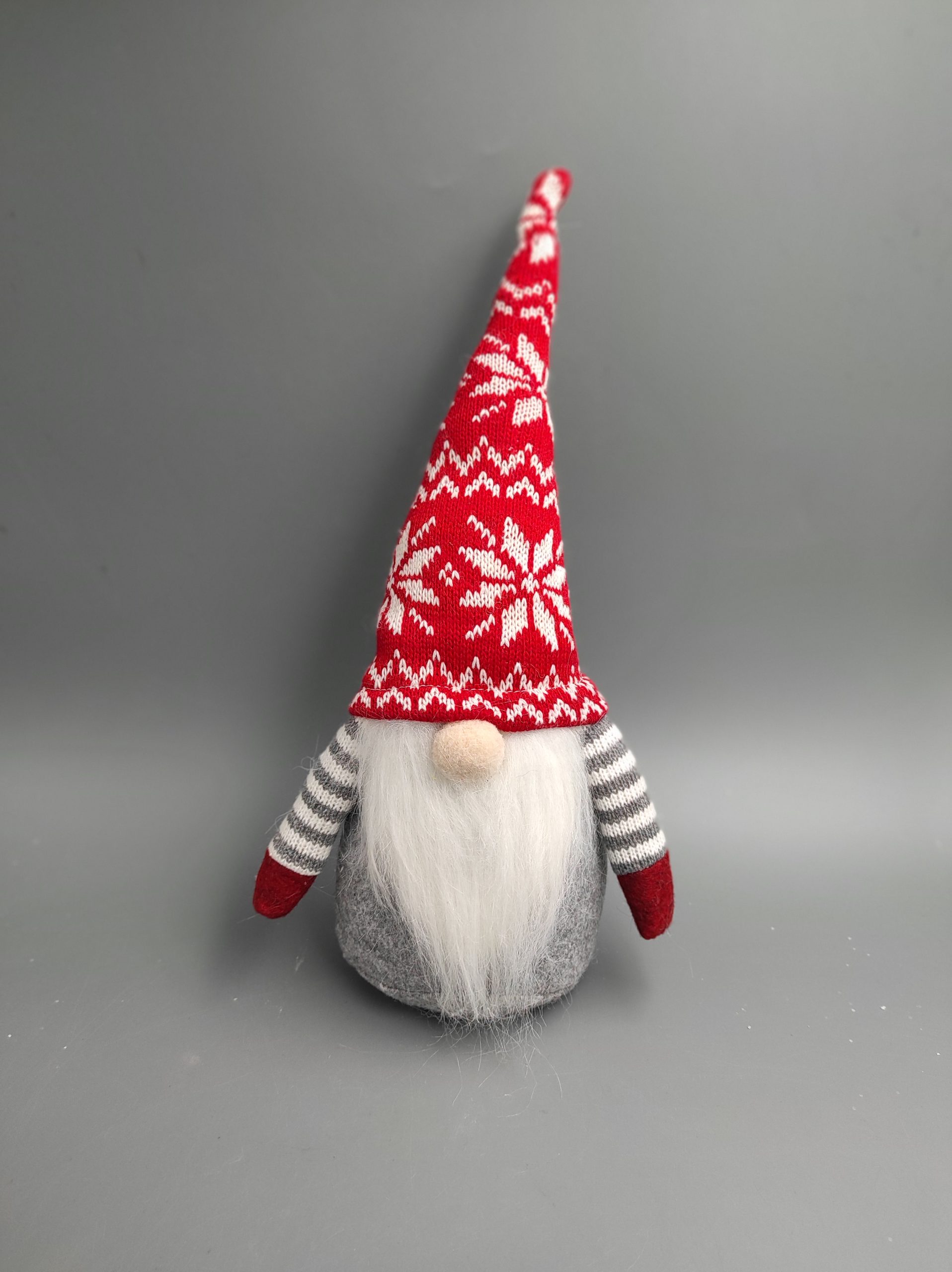 Plüss manó, norvég mintás sapkában. Nagy orrú és szakállú. Mérete 17x38cm. Piros, fehér és szürke színű. Termékkód: qx067158