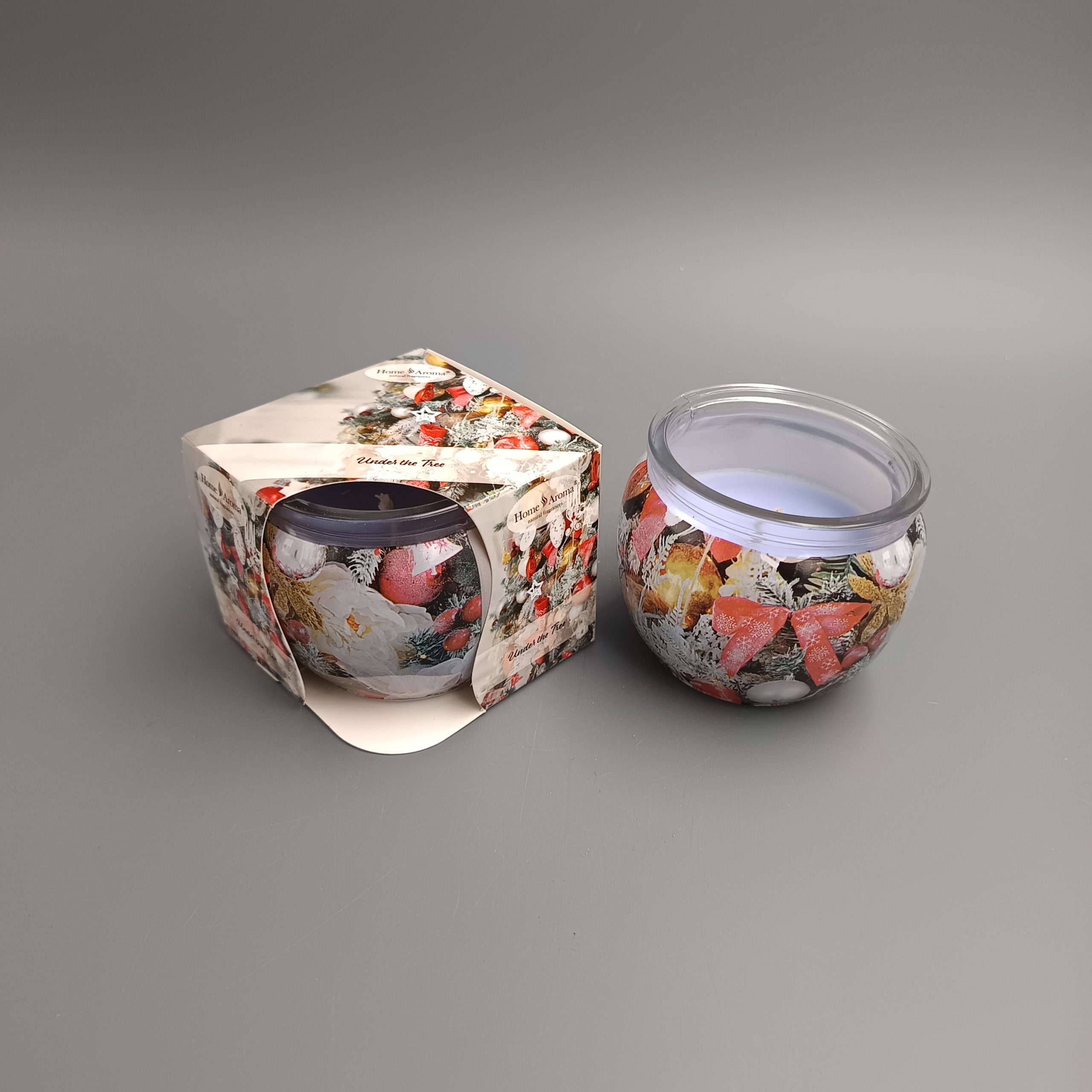 Poharas gyertya illatos. Bedíszített karácsonyfával és díszekkel. Gyümölcsös illattal. Mérete 6x7cm. Fehér, piros, arany, ezüst színű. Termékkód: b97080