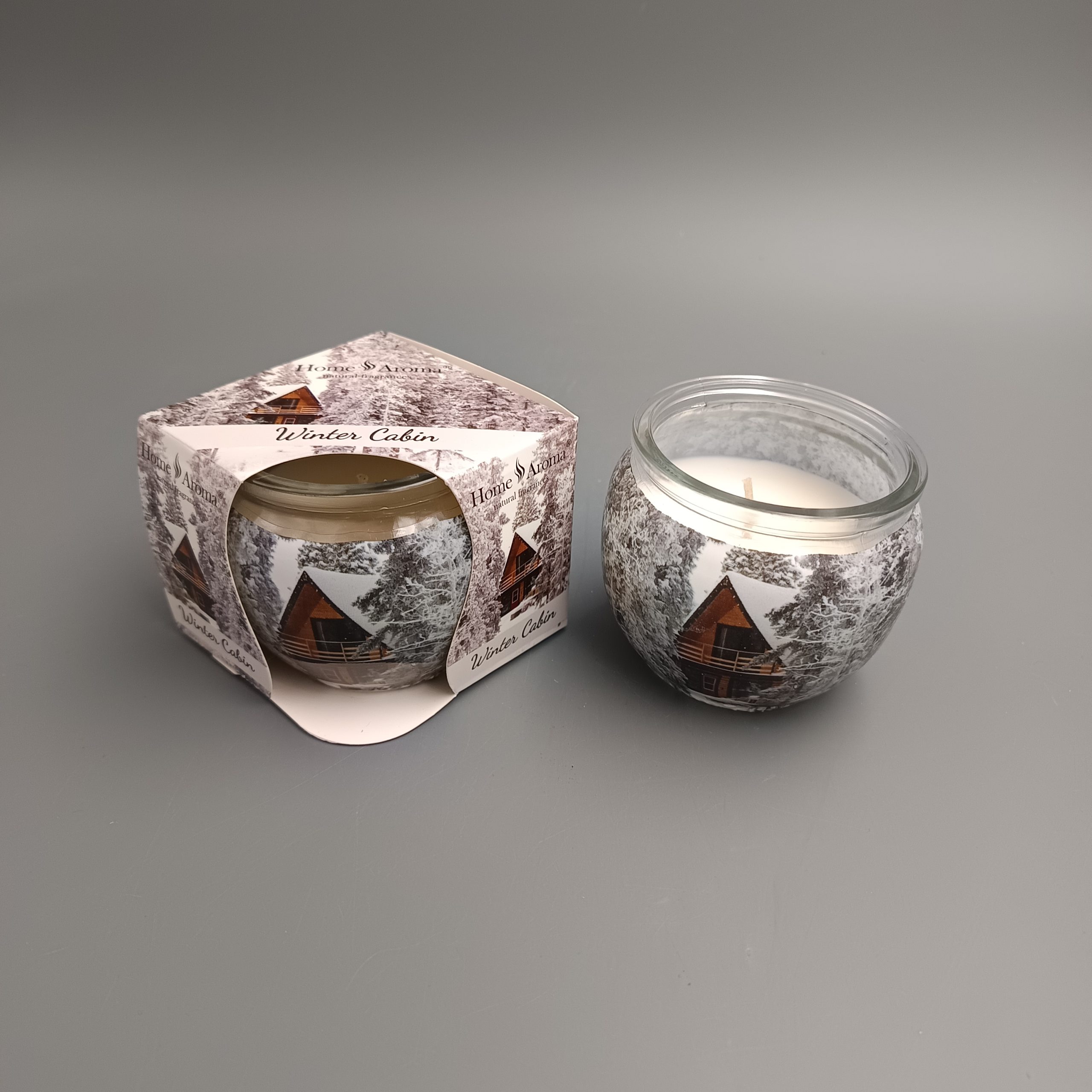 Poharas gyertya illatos. Havas téli tájjal és házzal. Parfümös illattal. Mérete 6x7cm. Fehér, barna és szürke színű. Termékkód: b97098