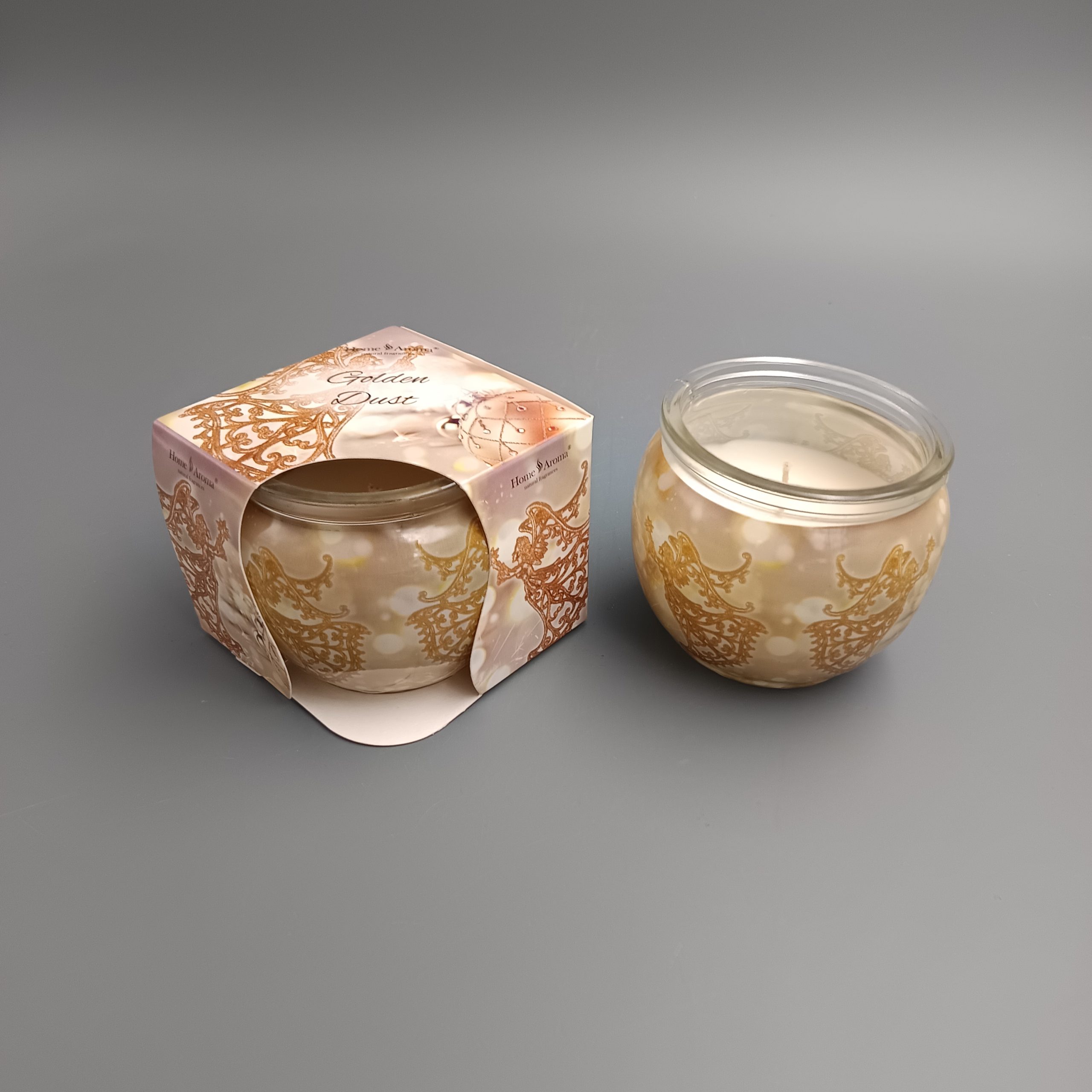 Poharas gyertya illatos. Angyalokkal és díszekkel. Parfümös illattal. Mérete 6x7cm. Fehér, arany és krém színű. Termékkód: b97072