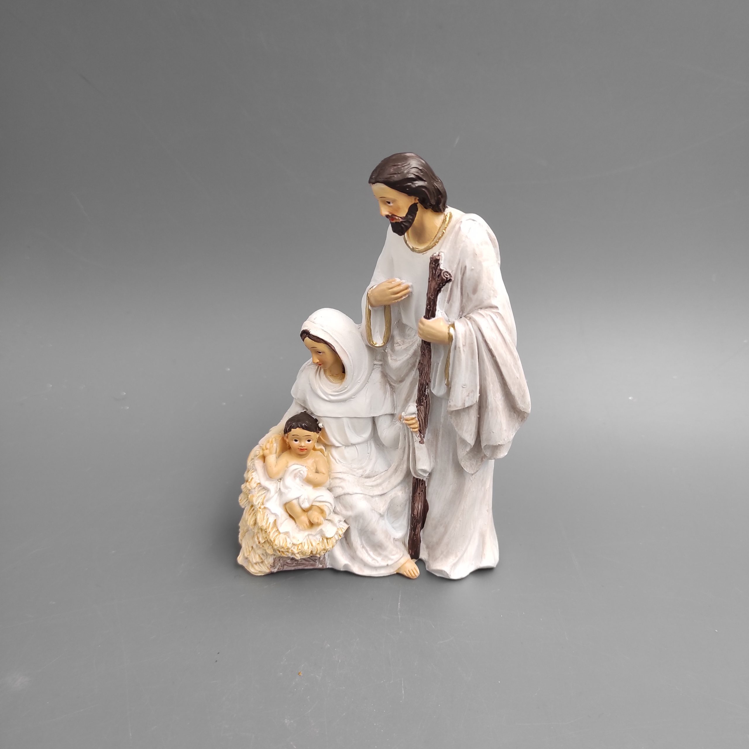 Szent család, műanyagból. Mária, József és a kis Jézus. Mérete 5x9x13cm. Fehér, barna és arany színű. Termékkód: at24-115564