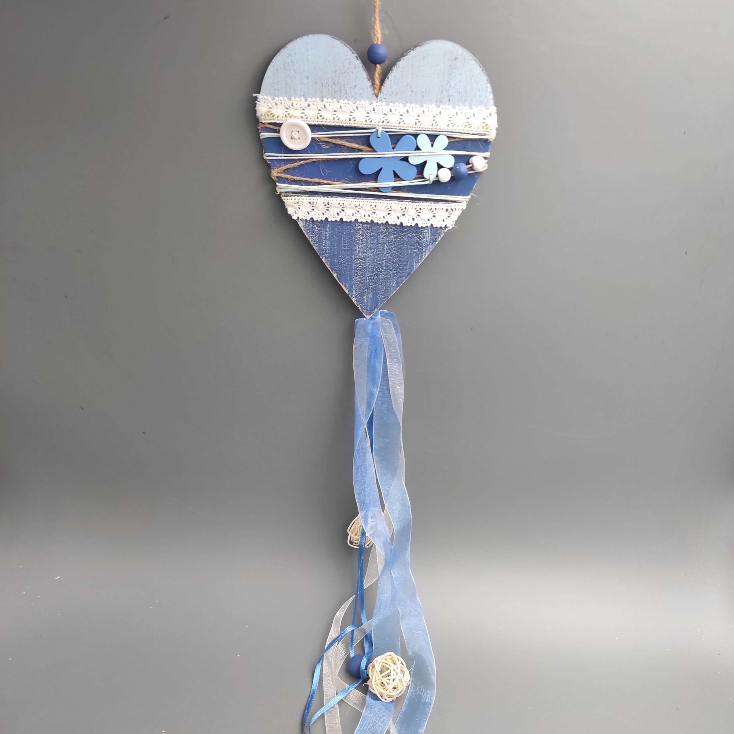 Szív alakú ajtódísz , akasztós, fa. Csipkével, gombbal zsinórral díszített. Mérete 14x 65cm. Sötétkék, világoskék és fehér színű. Termékkód: dd28194a