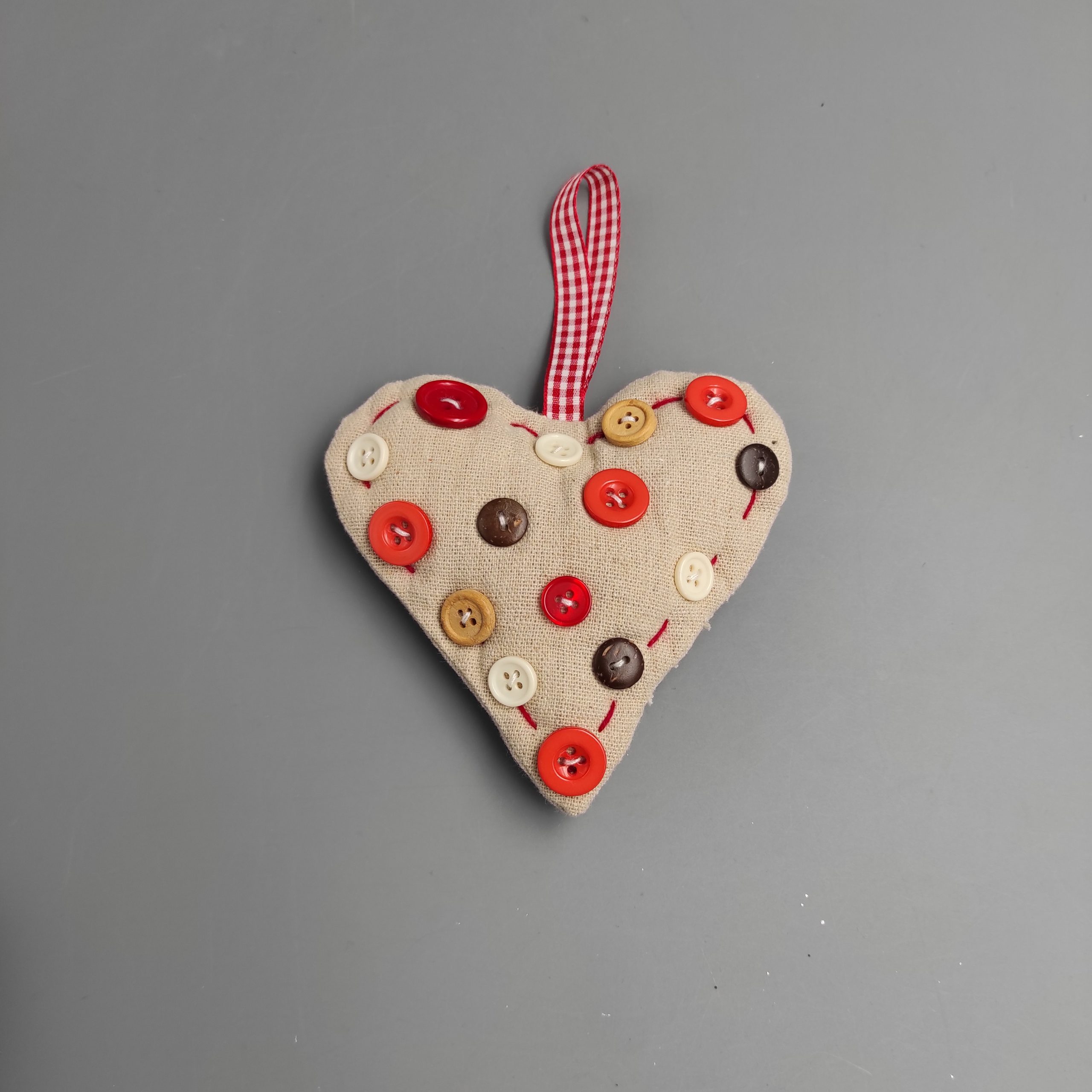 Szív vászonból, kockás akasztóval. Színes rávarrt gombokkal. Mérete 10x12cm. Natúr barna, piros és fehér színű. Termékkód: dd42905a