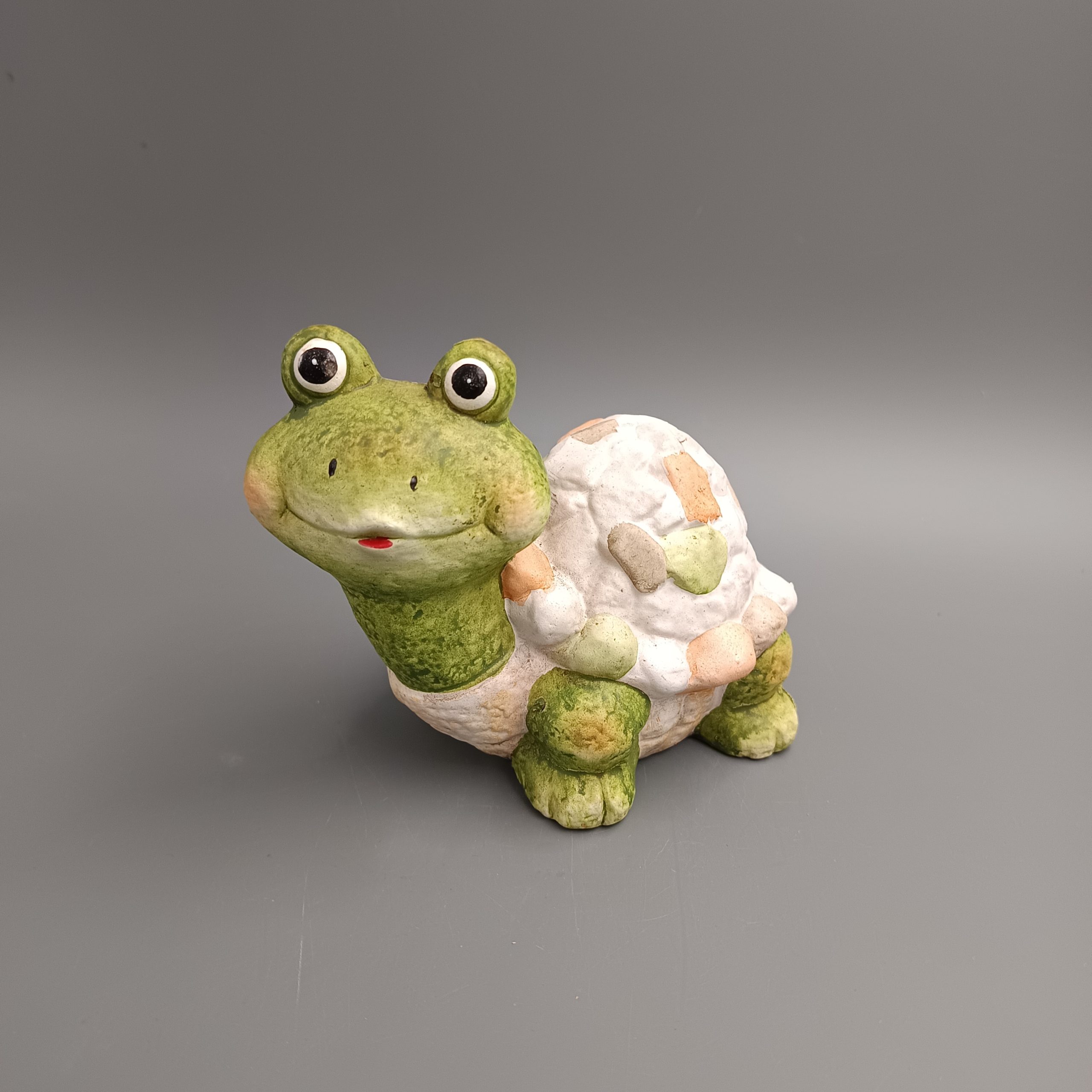 Teknősbéka kerámiából. Nagy kerek szemekkel, mosolygós arccal. Páncélját pasztell színű kövek díszítik. Mérete 8×11,5x14cm. Zöld, szürke, narancs és fehér színű. Termékkód: at240901