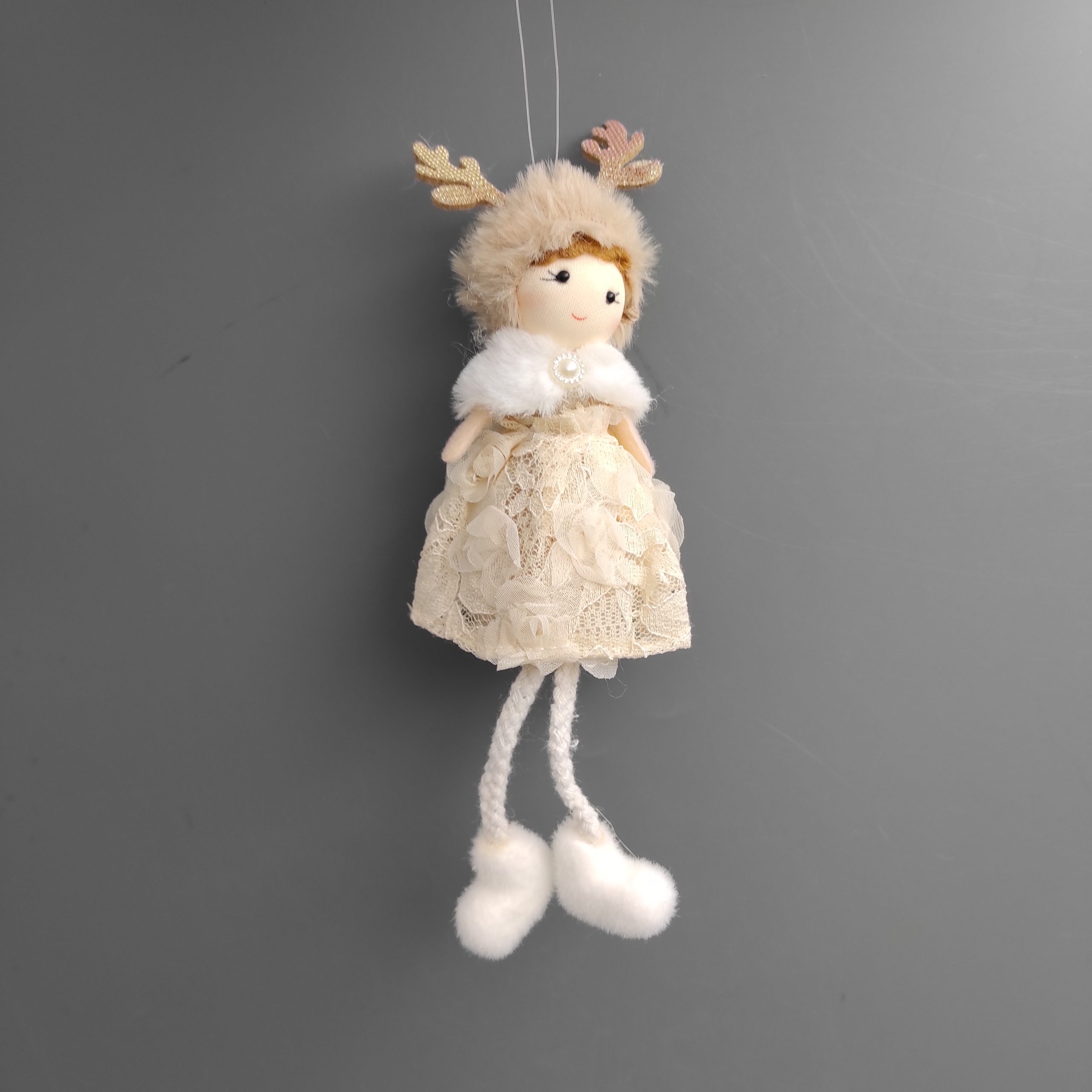 Textil kislány, akasztós. Prémes, csipke ruhában, szarvas agancsos sapkában. Mérete 8x8x20cm. Világosbarna és fehér színű. Termékkód: qx060585b