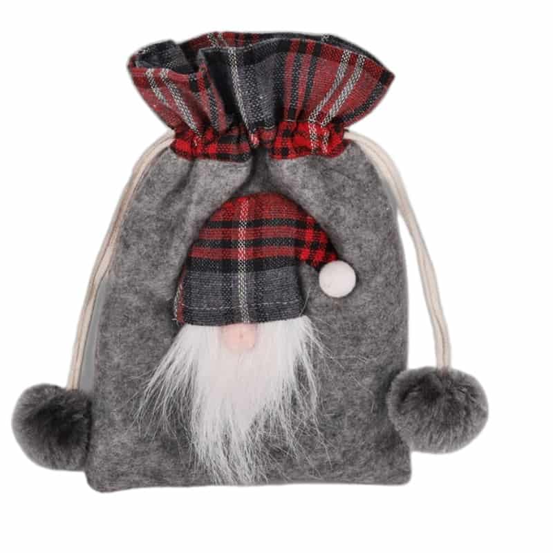 Textil mikulászsák, összehúzható a teteje. Télapó fejjel és kockás mintával. Mérete 15x20cm. Szürke, bordó és fehér színű. Termékkód: qx408364a