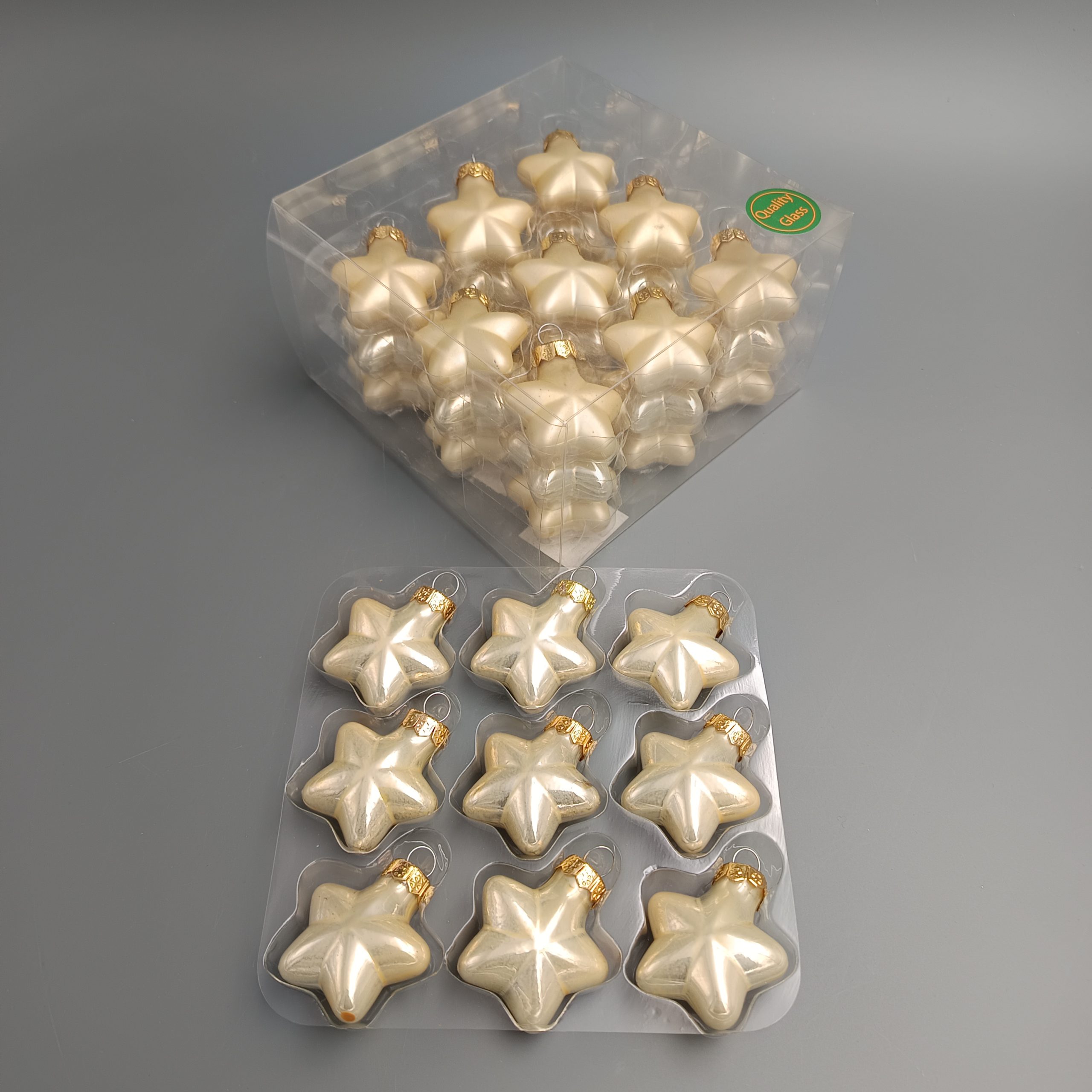 Üveg csillag szett, karácsonyfadísz, fém akasztóval. Mérete 4cm. A doboz 36 darab gömböt tartalmaz. Fényes, matt krém színű. Termékkód: 112048
