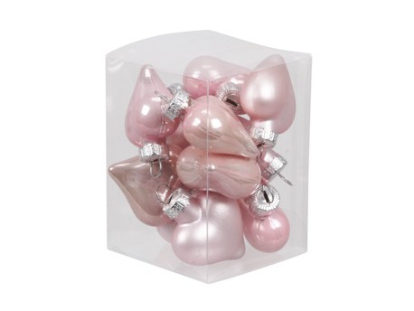 Üvegdísz szív alakú, fém akasztóval. Mérete 4cm. A doboz 12 darab díszt tartalmaz. Fényes és matt rózsaszínű. Termékkód: 124343
