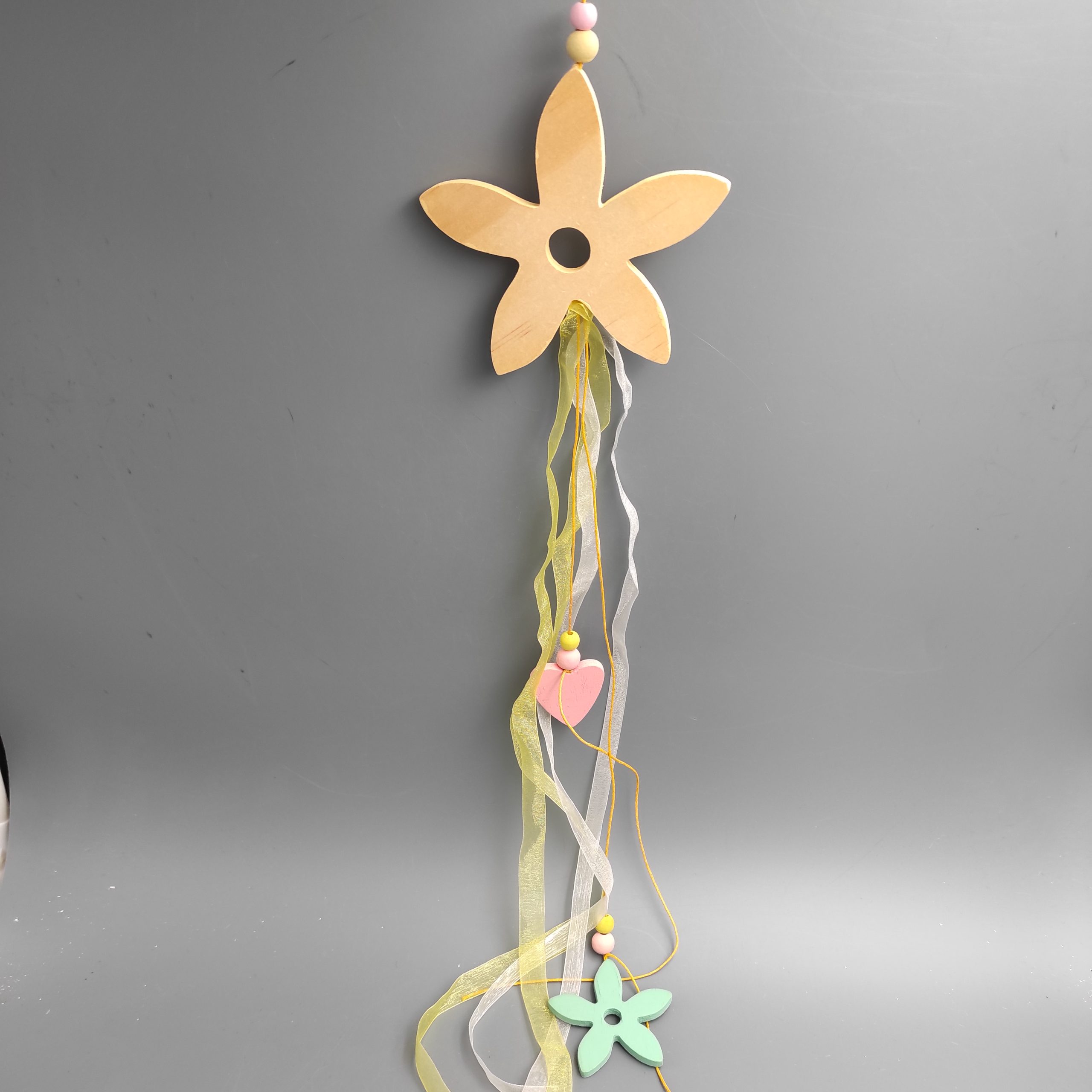 Virág alakú ajtódísz , fa. Szatén szalagokkal, szívvel és virággal. Mérete 12x55cm. Sárga, rózsaszín és türkiz kék színű. Termékkód: dd34024b