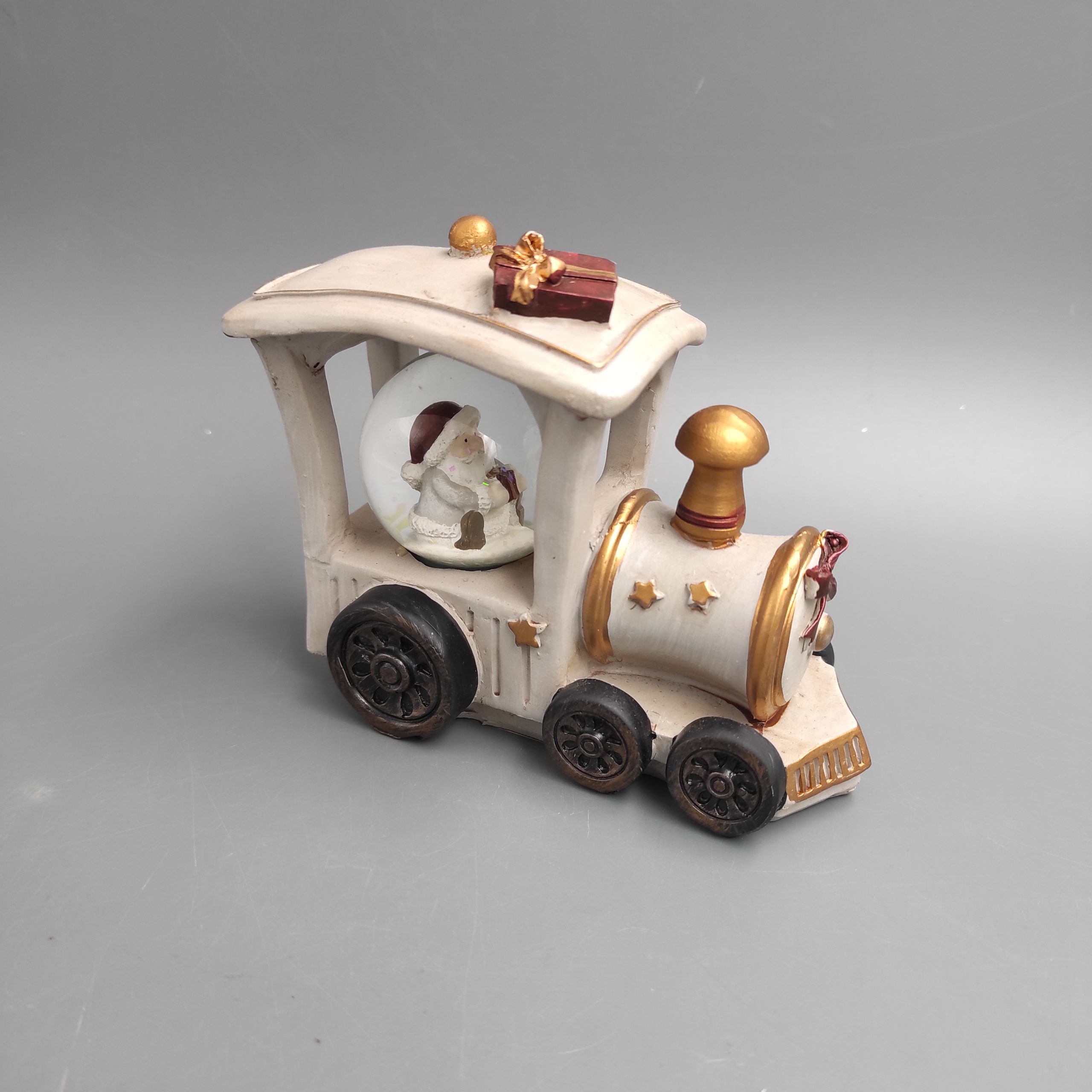 Vonat formájú rázógömb, műanyag és üveg. Mikulással a közepén. Mérete 6x10x13cm. Szürke, bordó és arany színű. Termékkód: dd66260